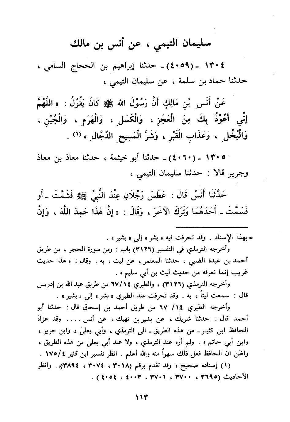 4059 - حَدَّثَنَا إِبْرَاهِيمُ بْنُ الْحَجَّاجِ السَّامِيُّ، حَدَّثَنَا حَمَّادُ بْنُ سَلَمَةَ، عَنْ سُلَيْمَانَ التَّيْمِيِّ، عَنْ أَنَسِ بْنِ مَالِكٍ، أَنَّ رَسُولَ اللَّهِ صَلَّى اللهُ عَلَيْهِ وَسَلَّمَ كَانَ يَقُولُ: «§اللَّهُمَّ إِنِّي أَعُوذُ بِكَ مِنَ الْعَجْزِ وَالْكَسَلِ، وَالْهَرَمِ وَالْجُبْنِ، وَالْبُخْلِ وَعَذَابِ الْقَبْرِ، وَشَرِّ الْمَسِيحِ الدَّجَّالِ» Kإسناده صحيح
