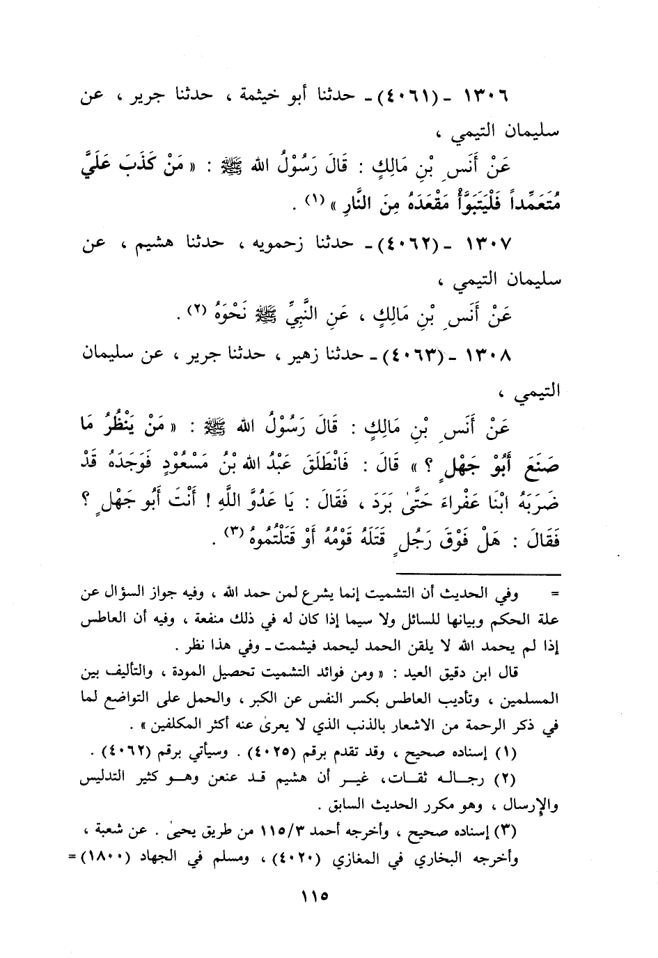 4061 - حَدَّثَنَا أَبُو خَيْثَمَةَ، حَدَّثَنَا جَرِيرٌ، عَنْ سُلَيْمَانَ التَّيْمِيِّ، عَنْ أَنَسِ بْنِ مَالِكٍ، قَالَ رَسُولُ اللَّهِ صَلَّى اللهُ عَلَيْهِ وَسَلَّمَ: «§مَنْ كَذَبَ عَلَيَّ مُتَعَمِّدًا فَلْيَتَبَوَّأْ مَقْعَدَهُ مِنَ النَّارِ»، Kإسناده صحيح