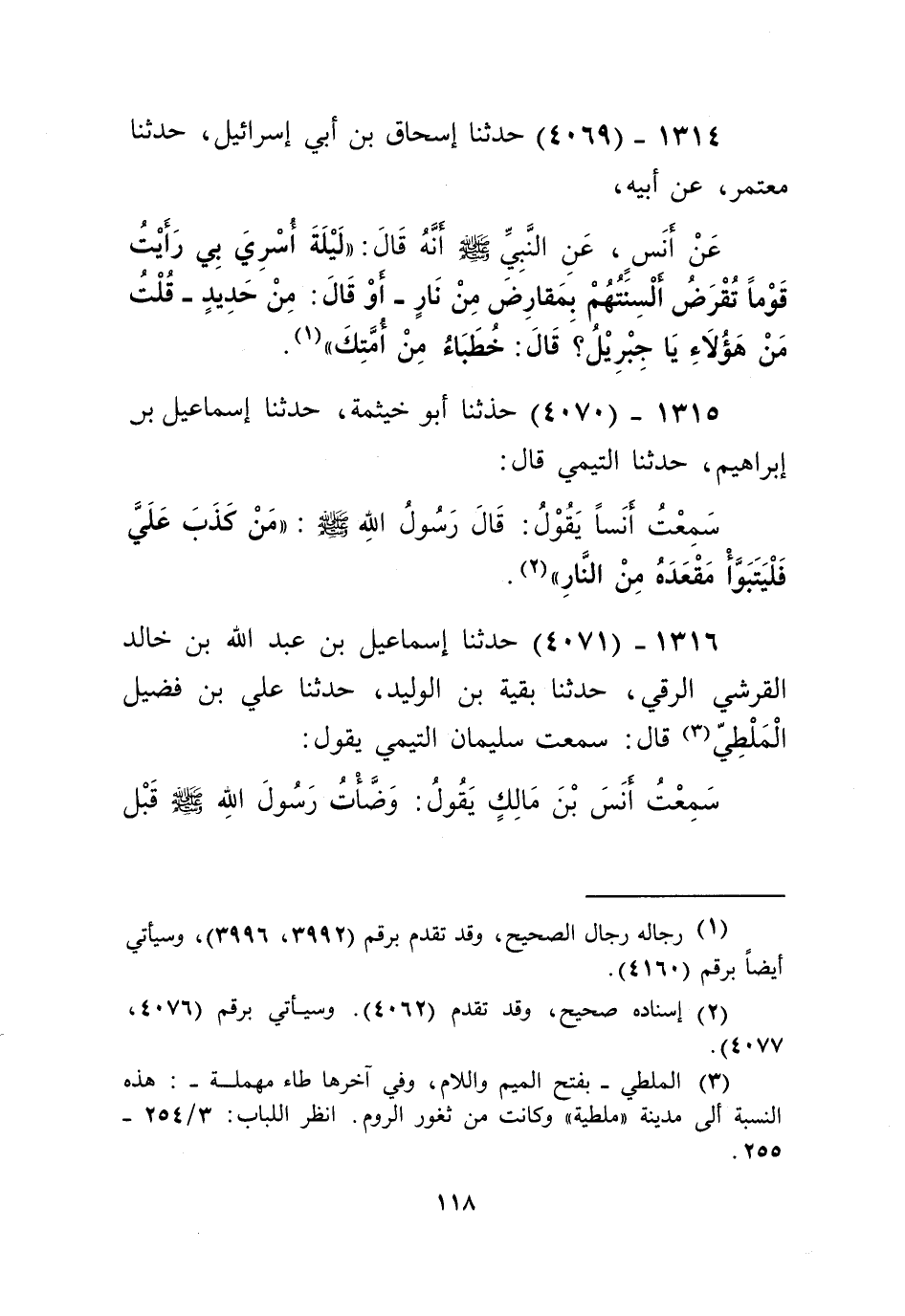 4069 - حَدَّثَنَا إِسْحَاقُ بْنُ أَبِي إِسْرَائِيلَ، حَدَّثَنَا مُعْتَمِرٌ، عَنْ أَبِيهِ، عَنْ أَنَسٍ، عَنِ النَّبِيِّ صَلَّى اللهُ عَلَيْهِ وَسَلَّمَ أَنَّهُ قَالَ: «§لَيْلَةَ أُسْرِيَ بِي رَأَيْتُ قَوْمًا تُقْرَضُ أَلْسِنَتُهُمْ بِمَقَارِضَ مِنْ نَارٍ»، أَوْ قَالَ: " مِنْ حَدِيدٍ، قُلْتُ: مَنْ هَؤُلَاءِ يَا جِبْرِيلُ؟ قَالَ: خُطَبَاءُ مِنْ أُمَّتِكَ "Kرجاله رجال الصحيح