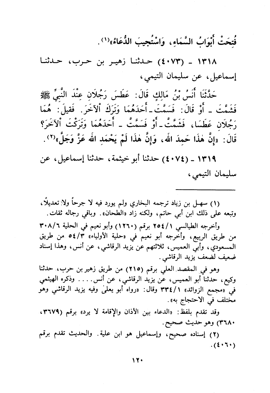 4073 - حَدَّثَنَا زُهَيْرُ بْنُ حَرْبٍ، حَدَّثَنَا إِسْمَاعِيلُ، عَنْ سُلَيْمَانَ التَّيْمِيِّ، حَدَّثَنَا أَنَسُ بْنُ مَالِكٍ، قَالَ: عَطَسَ رَجُلَانِ عِنْدَ النَّبِيِّ صَلَّى اللهُ عَلَيْهِ وَسَلَّمَ فَشَمَّتَ، أَوْ قَالَ: فَسَمَّتَ أَحَدَهُمَا وَتَرَكَ الْآخَرَ، فَقِيلَ: هُمَا رَجُلَانِ عَطَسَا، فَشَمَّتَّ، أَوْ فَسَمَّتَّ أَحَدَهُمَا وَتَرَكْتَ الْآخَرَ؟ قَالَ: «إِنَّ §هَذَا حَمِدَ اللَّهَ، وَإِنَّ هَذَا لَمْ يَحْمَدِ اللَّهَ عَزَّ وَجَلَّ» Kإسناده صحيح