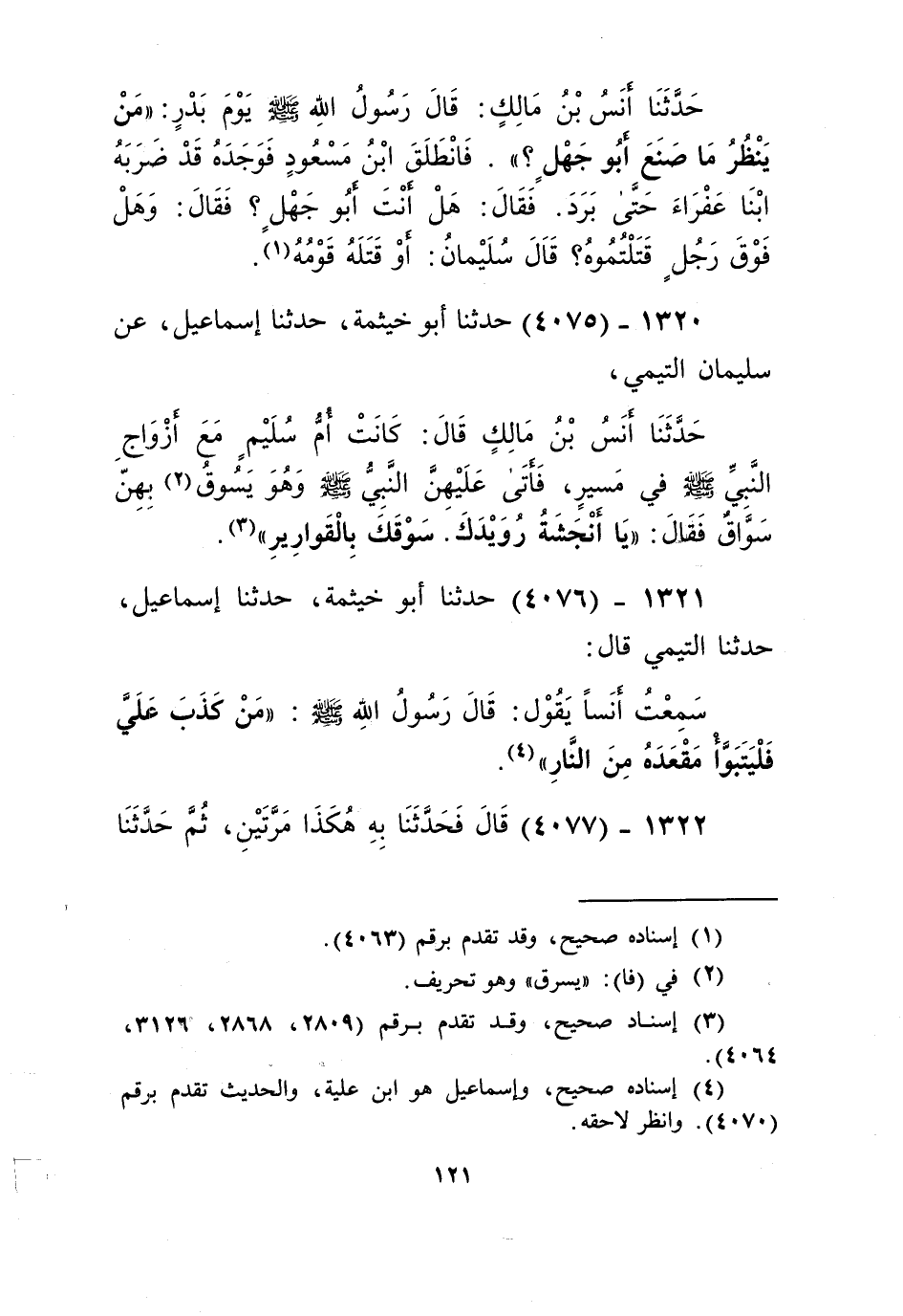 4076 - حَدَّثَنَا أَبُو خَيْثَمَةَ، حَدَّثَنَا إِسْمَاعِيلُ، حَدَّثَنَا التَّيْمِيُّ، قَالَ: سَمِعْتُ أَنَسًا يَقُولُ: قَالَ رَسُولُ اللَّهِ صَلَّى اللهُ عَلَيْهِ وَسَلَّمَ: «§مَنْ كَذَبَ عَلَيَّ فَلْيَتَبَوَّأْ مَقْعَدَهُ مِنَ النَّارِ»،