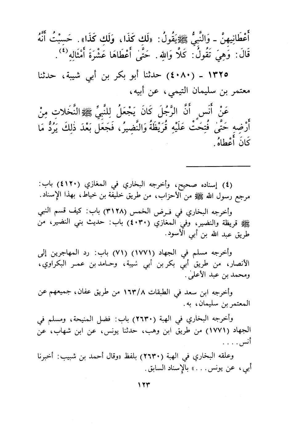 4080 - حَدَّثَنَا أَبُو بَكْرِ بْنُ أَبِي شَيْبَةَ، حَدَّثَنَا مُعْتَمِرُ بْنُ سُلَيْمَانَ التَّيْمِيُّ، عَنْ أَبِيهِ، عَنْ أَنَسٍ، أَنَّ §الرَّجُلَ كَانَ يَجْعَلُ لِلنَّبِيِّ صَلَّى اللهُ عَلَيْهِ وَسَلَّمَ النَّخَلَاتِ مِنْ أَرْضِهِ حَتَّى فُتِحَتْ عَلَيْهِ قُرَيْظَةُ وَالنَّضِيرُ، فَجَعَلَ بَعْدَ ذَلِكَ يَرُدُّ مَا كَانَ أَعْطَاهُ، قَالَ أَنَسٌ: وَإِنَّ أَهْلِي أَمَرُونِي أَنْ آتِيَ النَّبِيَّ صَلَّى اللهُ عَلَيْهِ وَسَلَّمَ فَأَسْأَلَهُ مَا كَانَ أَعْطَاهُ أَوْ بَعْضَهُ، وَكَانَ نَبِيُّ اللَّهِ صَلَّى اللهُ عَلَيْهِ وَسَلَّمَ قَدْ أَعْطَاهُ أُمَّ أَيْمَنَ، فَأَتَيْتُ النَّبِيَّ صَلَّى اللهُ عَلَيْهِ وَسَلَّمَ فَأَعْطَانِيهِنَّ، فَجَاءَتْ أُمُّ أَيْمَنَ فَجَعَلَتِ الثَّوْبَ فِي عُنُقِي وَقَالَتْ: وَاللَّهِ لَا يُعْطِيكَهُنَّ وَقَدْ أَعْطَانِيهِنَّ، قَالَ نَبِيُّ اللَّهِ صَلَّى اللهُ عَلَيْهِ وَسَلَّمَ: «يَا أُمَّ أَيْمَنَ، اتْرُكِيهِ وَلَكِ كَذَا وَكَذَا»، تَقُولُ: كَلَّا وَالَّذِي لَا إِلَهَ إِلَّا هُوَ، فَجَعَلَ يَقُولُ: «كَذَا»، حَتَّى أَعْطَاهَا عَشَرَةَ أَمْثَالِهِ، أَوْ قَرِيبًا مِنْ عَشَرَةِ أَمْثَالِهِKإسناده صحيح