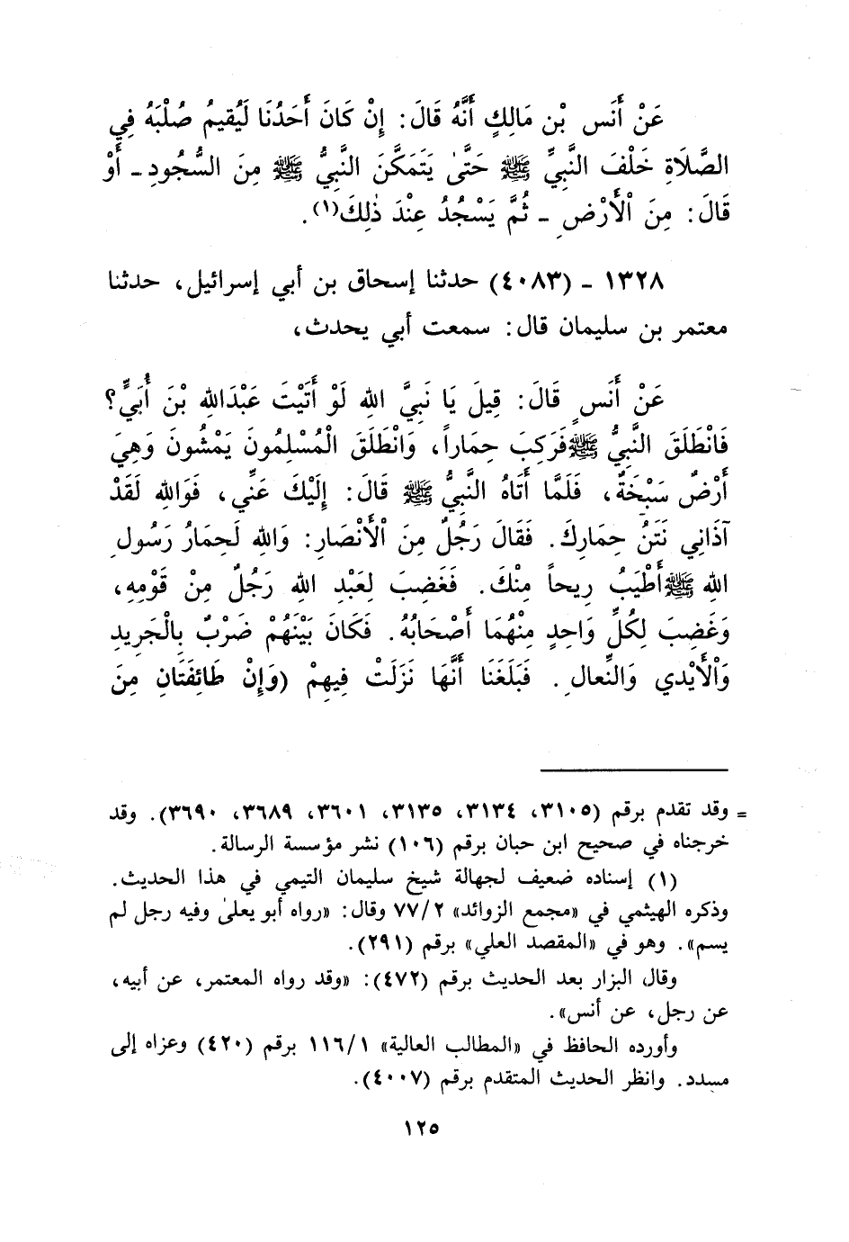 4083 - حَدَّثَنَا إِسْحَاقُ بْنُ أَبِي إِسْرَائِيلَ، حَدَّثَنَا مُعْتَمِرُ بْنُ سُلَيْمَانَ، قَالَ: سَمِعْتُ أَبِي يُحَدِّثُ، عَنْ أَنَسٍ قَالَ: قِيلَ: يَا نَبِيَّ اللَّهِ، لَوْ أَتَيْتَ عَبْدَ اللَّهِ بْنَ أُبَيٍّ؟ فَانْطَلَقَ النَّبِيُّ صَلَّى اللهُ عَلَيْهِ وَسَلَّمَ فَرَكِبَ حِمَارًا، وَانْطَلَقَ الْمُسْلِمُونَ يَمْشُونَ وَهِيَ أَرْضٌ سَبْخَةٌ، فَلَمَّا أَتَاهُ النَّبِيُّ صَلَّى اللهُ عَلَيْهِ وَسَلَّمَ قَالَ: إِلَيْكَ عَنِّي، فَوَاللَّهِ لَقَدْ آذَانِي نَتْنُ حِمَارِكَ، فَقَالَ رَجُلٌ مِنَ الْأَنْصَارِ: وَاللَّهِ لَحِمَارُ رَسُولِ اللَّهِ صَلَّى اللهُ عَلَيْهِ وَسَلَّمَ أَطْيَبُ رِيحًا مِنْكَ، فَغَضِبَ لِعَبْدِ اللَّهِ رَجُلٌ مِنْ قَوْمِهِ، وَغَضِبَ لِكُلِّ وَاحِدٍ مِنْهُمَا أَصْحَابُهُ، فَكَانَ بَيْنَهُمْ ضَرْبٌ بِالْجَرِيدِ وَالْأَيْدِي وَالنِّعَالِ، فَبَلَغَنَا أَنَّهَا نَزَلَتْ فِيهِمْ " {§وَإِنْ طَائِفَتَانِ مِنَ الْمُؤْمِنِينَ اقْتَتَلُوا فَأَصْلِحُوا بَيْنَهُمَا} [الحجرات: 9] "Kإسناده صحيح