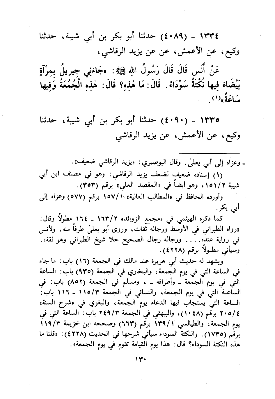 4089 - حَدَّثَنَا أَبُو بَكْرِ بْنُ أَبِي شَيْبَةَ، حَدَّثَنَا وَكِيعٌ، عَنِ الْأَعْمَشِ، عَنْ يَزِيدَ الرَّقَاشِيِّ، عَنْ أَنَسٍ قَالَ: قَالَ رَسُولُ اللَّهِ صَلَّى اللهُ عَلَيْهِ وَسَلَّمَ: " §جَاءَنِي جِبْرِيلُ بِمِرْآةٍ بَيْضَاءَ فِيهَا نُكْتَةٌ سَوْدَاءُ، قَالَ: مَا هَذِهِ؟ قَالَ: هَذِهِ الْجُمُعَةُ وَفِيهَا سَاعَةٌ "Kإسناده ضعيف