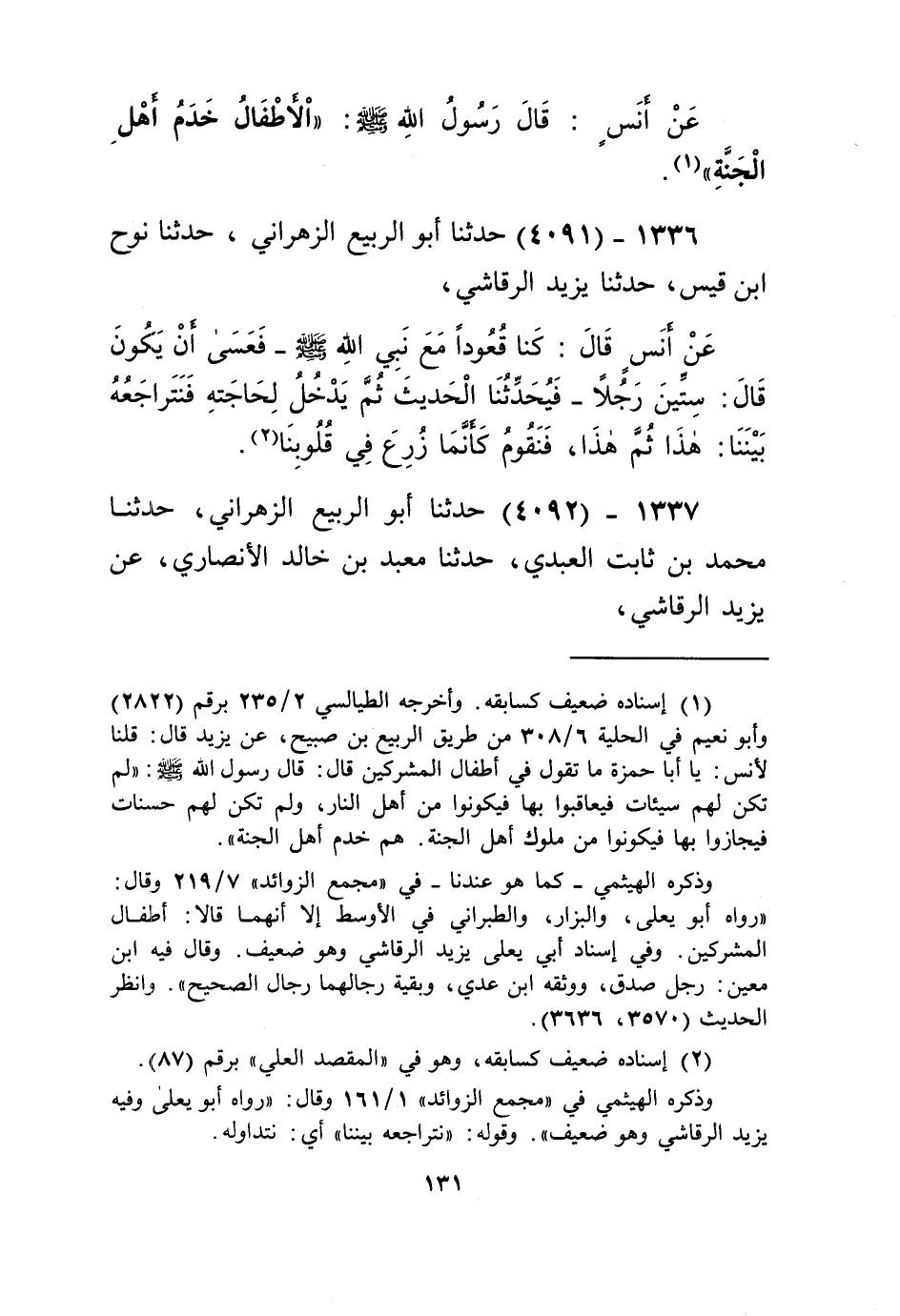 4091 - حَدَّثَنَا أَبُو الرَّبِيعِ الزَّهْرَانِيُّ، حَدَّثَنَا نُوحُ بْنُ قَيْسٍ، حَدَّثَنَا يَزِيدُ الرَّقَاشِيُّ، عَنْ أَنَسٍ قَالَ: " كُنَّا قُعُودًا مَعَ نَبِيِّ اللَّهِ صَلَّى اللهُ عَلَيْهِ وَسَلَّمَ، فَعَسَى أَنْ يَكُونَ قَالَ: سِتِّينَ رَجُلًا، §فَيُحَدِّثُنَا الْحَدِيثَ ثُمَّ يَدْخُلُ لِحَاجَتِهِ فَنَتَرَاجَعُهُ بَيْنَنَا، هَذَا ثُمَّ هَذَا، فَنَقُومُ كَأَنَّمَا زُرِعَ فِي قُلُوبِنَا "Kإسناده ضعيف