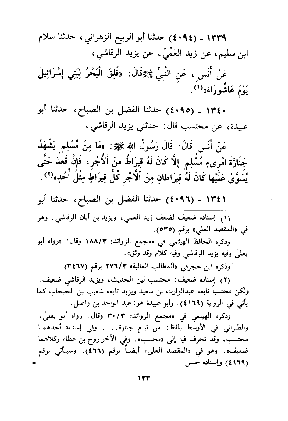 4094 - حَدَّثَنَا أَبُو الرَّبِيعِ الزَّهْرَانِيُّ، حَدَّثَنَا سَلَّامُ بْنُ سُلَيْمٍ، عَنْ زَيْدٍ الْعَمِّيِّ، عَنْ يَزِيدَ الرَّقَاشِيِّ، عَنْ أَنَسٍ، عَنِ النَّبِيِّ صَلَّى اللهُ عَلَيْهِ وَسَلَّمَ قَالَ: «§فُلِقَ الْبَحْرُ لِبَنِي إِسْرَائِيلَ يَوْمَ عَاشُورَاءَ» Kإسناده ضعيف