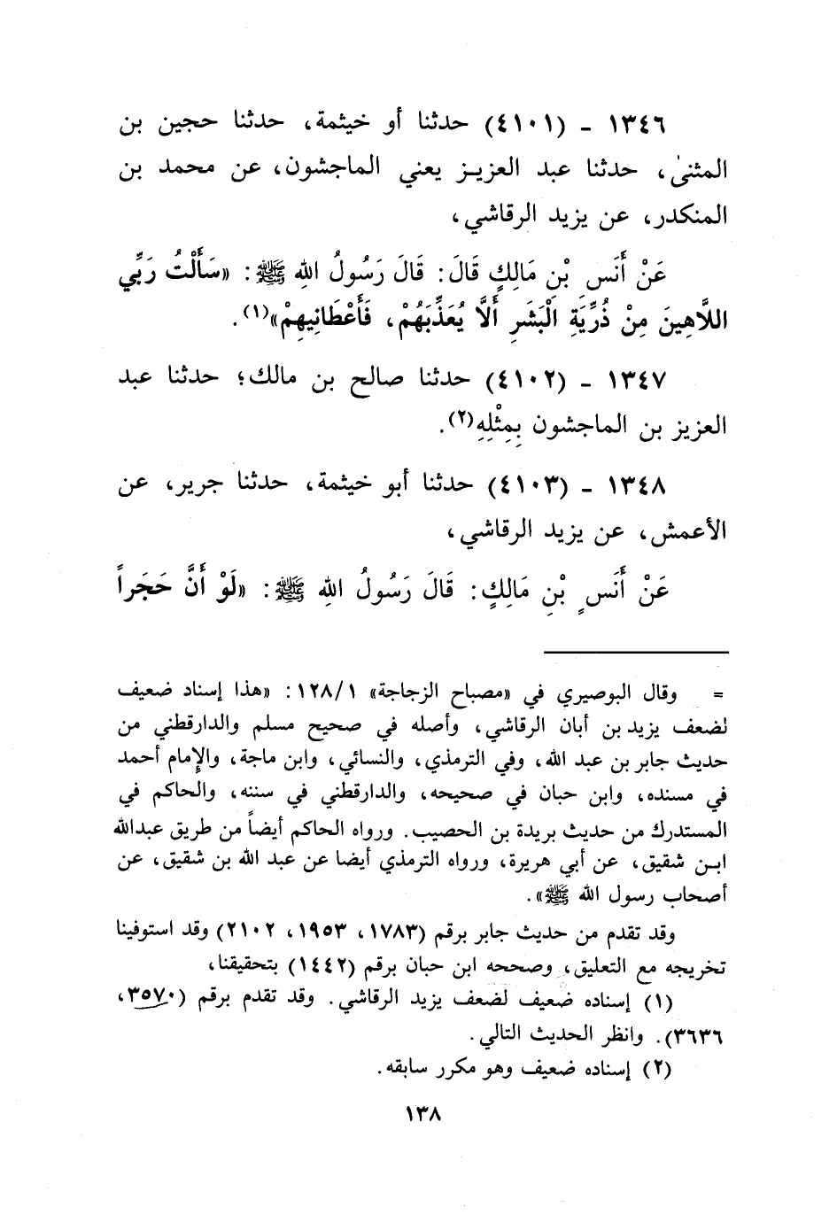 4101 - حَدَّثَنَا أَبُو خَيْثَمَةَ، حَدَّثَنَا حُجَيْنُ بْنُ الْمُثَنَّى، حَدَّثَنَا عَبْدُ الْعَزِيزِ يَعْنِي الْمَاجِشُونَ، عَنْ مُحَمَّدِ بْنِ الْمُنْكَدِرِ، عَنْ يَزِيدَ الرَّقَاشِيِّ، عَنْ أَنَسِ بْنِ مَالِكٍ قَالَ: قَالَ رَسُولُ اللَّهِ صَلَّى اللهُ عَلَيْهِ وَسَلَّمَ: «§سَأَلْتُ رَبِّي اللَّاهِينَ مِنْ ذُرِّيَّةِ الْبَشَرِ أَلَّا يُعَذِّبَهُمْ، فَأَعْطَانِيهِمْ»، Kإسناده ضعيف