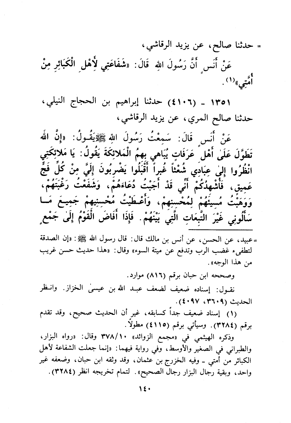 4106 - حَدَّثَنَا إِبْرَاهِيمُ بْنُ الْحَجَّاجِ النِّيلِيُّ، حَدَّثَنَا صَالِحٌ الْمُرِّيُّ، عَنْ يَزِيدَ الرَّقَاشِيِّ، عَنْ أَنَسٍ قَالَ: سَمِعْتُ رَسُولَ اللَّهِ صَلَّى اللهُ عَلَيْهِ وَسَلَّمَ يَقُولُ: " إِنَّ اللَّهَ تَطَوَّلَ عَلَى أَهْلِ عَرَفَاتٍ، يُبَاهِي بِهِمُ الْمَلَائِكَةَ، يَقُولُ: يَا مَلَائِكَتِي، §انْظُرُوا إِلَى عِبَادِي شُعْثًا غُبْرًا، أَقْبَلُوا يَضْرِبُونَ إِلَيَّ مِنْ كُلِّ فَجٍّ عَمِيقٍ، فَأُشْهِدُكُمْ أَنِّي قَدْ أَجَبْتُ دُعَاءَهُمْ، وَشَفَعْتُ رَغْبَتَهُمْ، وَوَهَبْتُ مُسِيئَهُمْ لِمُحْسِنِهِمْ، وَأَعْطَيْتُ مُحْسِنِيهِمْ جَمِيعَ مَا سَأَلُونِي غَيْرَ التَّبِعَاتِ الَّتِي بَيْنَهُمْ، فَإِذَا أَفَاضَ الْقَوْمُ إِلَى جَمْعٍ وَوَقَفُوا وَعَادُوا فِي الرَّغْبَةِ وَالطَّلَبِ إِلَى اللَّهِ، يَقُولُ: يَا مَلَائِكَتِي، عِبَادِي وَقَفُوا فَعَادُوا فِي الرَّغْبَةِ وَالطَّلَبِ، فَأُشْهِدُكُمْ أَنِّي قَدْ أَجَبْتُ دُعَاءَهُمْ، وَشَفَعْتُ رَغْبَتَهُمْ، وَوَهَبْتُ مُسِيئَهُمْ لِمُحْسِنِهِمْ، وَأَعْطَيْتُ مُحْسِنَهُمْ جَمِيعَ مَا سَأَلَنِي، وَكَفَلْتُ عَنْهُمُ التَّبِعَاتِ الَّتِي بَيْنَهُمْ "Kإسناده ضعيف جدا