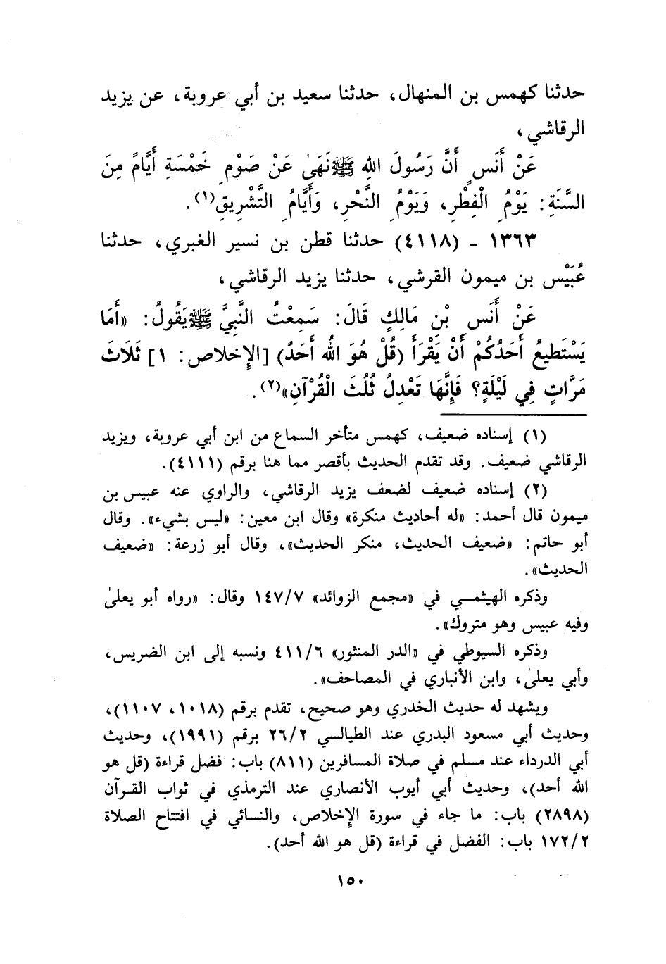 4118 - حَدَّثَنَا قَطَنُ بْنُ نُسَيْرٍ الْغُبَرِيُّ، حَدَّثَنَا عُبَيْسُ بْنُ مَيْمُونٍ الْقُرَشِيُّ، حَدَّثَنَا يَزِيدُ الرَّقَاشِيُّ، عَنْ أَنَسِ بْنِ مَالِكٍ قَالَ: سَمِعْتُ النَّبِيَّ صَلَّى اللهُ عَلَيْهِ وَسَلَّمَ يَقُولُ: «§أَمَا يَسْتَطِيعُ أَحَدُكُمْ أَنْ يُقْرَأَ قُلْ هُوَ اللَّهُ أَحَدٌ ثَلَاثَ مَرَّاتٍ فِي لَيْلَةٍ؟ فَإِنَّهَا تَعْدِلُ ثُلُثَ الْقُرْآنِ» Kإسناده ضعيف