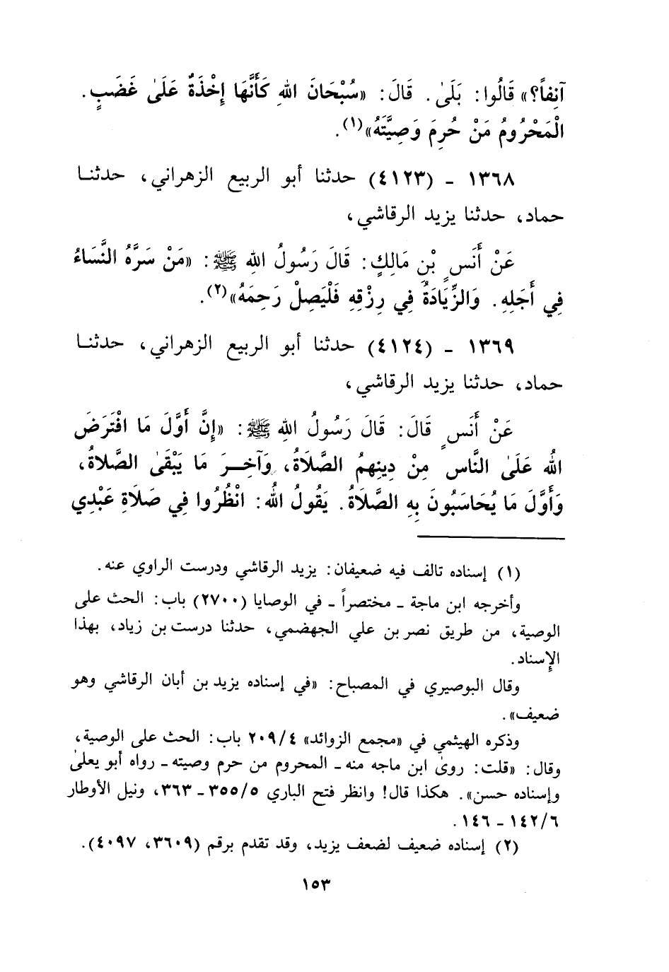 4123 - حَدَّثَنَا أَبُو الرَّبِيعِ الزَّهْرَانِيُّ، حَدَّثَنَا حَمَّادٌ، حَدَّثَنَا يَزِيدُ الرَّقَاشِيُّ، عَنْ أَنَسِ بْنِ مَالِكٍ، قَالَ رَسُولُ اللَّهِ صَلَّى اللهُ عَلَيْهِ وَسَلَّمَ: «§مَنْ سَرَّهُ النَّسَاءُ فِي أَجَلِهِ، وَالزِّيَادَةُ فِي رِزْقِهِ فَلْيَصِلْ رَحِمَهُ» Kإسناده ضعيف
