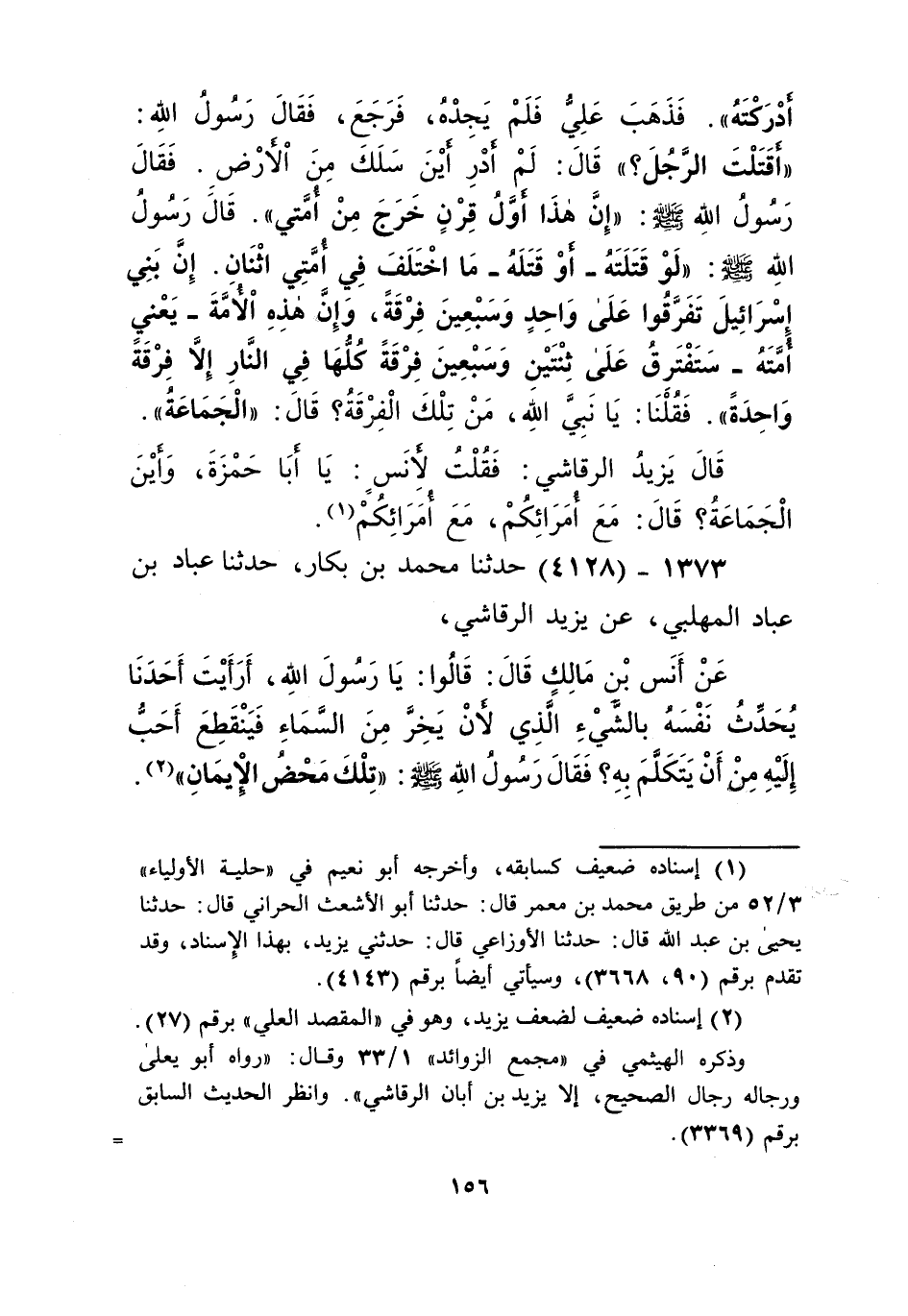 4128 - حَدَّثَنَا مُحَمَّدُ بْنُ بَكَّارٍ، حَدَّثَنَا عَبَّادُ بْنُ عَبَّادٍ الْمُهَلَّبِيُّ، عَنْ يَزِيدَ الرَّقَاشِيِّ، عَنْ أَنَسِ بْنِ مَالِكٍ قَالَ: قَالُوا: يَا رَسُولَ اللَّهِ، أَرَأَيْتَ أَحَدَنَا يُحَدِّثُ نَفْسَهُ بِالشَّيْءِ الَّذِي لَأَنْ يَخِرَّ مِنَ السَّمَاءِ فَيَنْقَطِعَ أَحَبُّ إِلَيْهِ مِنْ أَنْ يَتَكَلَّمَ بِهِ؟ فَقَالَ رَسُولُ اللَّهِ صَلَّى اللهُ عَلَيْهِ وَسَلَّمَ: «§تِلْكَ مَحْضُ الْإِيمَانِ» Kإسناده ضعيف