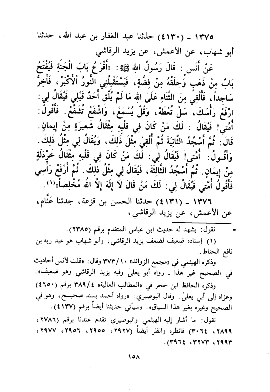 4130 - حَدَّثَنَا عَبْدُ الْغَفَّارِ بْنُ عَبْدِ اللَّهِ، حَدَّثَنَا أَبُو شِهَابٍ، عَنِ الْأَعْمَشِ، عَنْ يَزِيدَ الرَّقَاشِيِّ، عَنْ أَنَسٍ، قَالَ رَسُولُ اللَّهِ صَلَّى اللهُ عَلَيْهِ وَسَلَّمَ: " §أَقْرَعُ بَابَ الْجَنَّةِ فَيُفْتَحُ بَابٌ مِنْ ذَهَبٍ وَحِلَقُهُ مِنْ فِضَّةٍ، فَيَسْتَقْبِلُنِي النُّورُ الْأَكْبَرُ، فَأَخِرُّ سَاجِدًا، فَأُلْقِي مِنَ الثَّنَاءِ عَلَى اللَّهِ مَا لَمْ يُلْقِ أَحَدٌ قَبْلِي، فَيُقَالُ لِي: ارْفَعْ رَأْسَكَ، سَلْ تُعْطَهْ، وَقُلْ يُسْمَعْ، وَاشْفَعْ تُشَفَّعْ، فَأَقُولُ: أُمَّتِي، فَيُقَالُ: لَكَ مَنْ كَانَ فِي قَلْبِهِ مِثْقَالُ شَعِيرَةٍ مِنْ إِيمَانٍ، قَالَ: ثُمَّ أَسْجُدُ الثَّانِيَةَ، ثُمَّ أُلْقِي مِثْلَ ذَلِكَ، وَيُقَالُ لِي: مِثْلُ ذَلِكَ، وَأَقُولُ: أُمَّتِي، فَيُقَالُ لِي: لَكَ مَنْ كَانَ فِي قَلْبِهِ مِثْقَالُ خَرْدَلَةٍ مِنْ إِيمَانٍ، ثُمَّ أَسْجُدُ الثَّالِثَةَ، فَيُقَالُ لِي: مِثْلُ ذَلِكَ، ثُمَّ أَرْفَعُ رَأْسِي فَأَقُولُ: أُمَّتِي، فَيُقَالُ لِي: لَكَ مَنْ قَالَ: لَا إِلَهَ إِلَّا اللَّهُ مُخْلِصًا "Kإسناده ضعيف