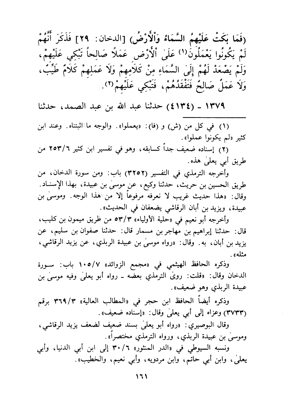 4134 - حَدَّثَنَا عَبْدُ اللَّهِ بْنُ عَبْدِ الصَّمَدِ، حَدَّثَنَا مُحَمَّدُ بْنُ حُمَيْدٍ، عَنِ ابْنِ الْمُبَارَكِ، عَنْ عِمْرَانَ بْنِ زَيْدٍ، حَدَّثَنَا يَزِيدُ الرَّقَاشِيُّ، عَنْ أَنَسِ بْنِ مَالِكٍ قَالَ: سَمِعْتُ رَسُولَ اللَّهِ صَلَّى اللهُ عَلَيْهِ وَسَلَّمَ يَقُولُ: «يَا أَيُّهَا النَّاسُ، §ابْكُوا، فَإِنْ لَمْ تَبْكُوا فَتَبَاكَوْا، فَإِنَّ أَهْلَ النَّارِ يَبْكُونَ فِي النَّارِ حَتَّى تَسِيلَ دُمُوعُهُمْ فِي وُجُوهِهِمْ كَأَنَّهَا جَدَاوِلُ، حَتَّى تَنْقَطِعَ الدُّمُوعُ، فَتَسِيلَ ـ يَعْنِي الدِّمَاءَ ـ فَتُقَرِّحَ الْعُيُونَ، فَلَوْ أَنَّ سُفُنًا أُرْخِيَتْ فِيهَا لَجَرَتْ» Kإسناده ضعيف جدا