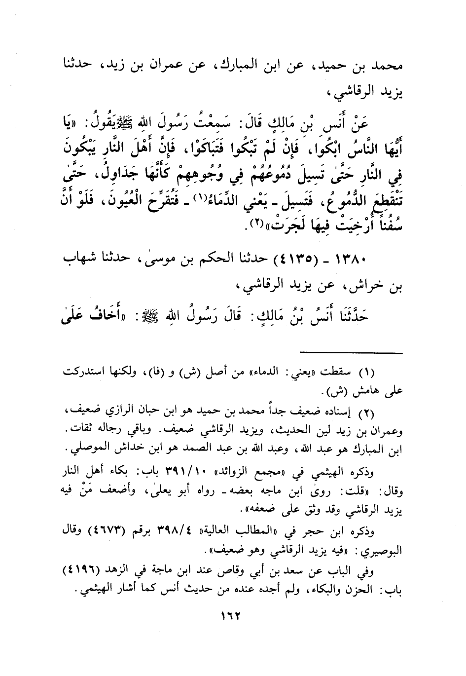 4135 - حَدَّثَنَا الْحَكَمُ بْنُ مُوسَى، حَدَّثَنَا شِهَابُ بْنُ خِرَاشٍ، عَنْ يَزِيدَ الرَّقَاشِيِّ، حَدَّثَنَا أَنَسُ بْنُ مَالِكٍ، قَالَ رَسُولُ اللَّهِ صَلَّى اللهُ عَلَيْهِ وَسَلَّمَ: " §أَخَافُ عَلَى أُمَّتِي بَعْدِي خَمْسًا: تَكْذِيبٌ بِالْقَدَرِ، وَتَصْدِيقٌ بِالنُّجُومِ "Kإسناده ضعيف