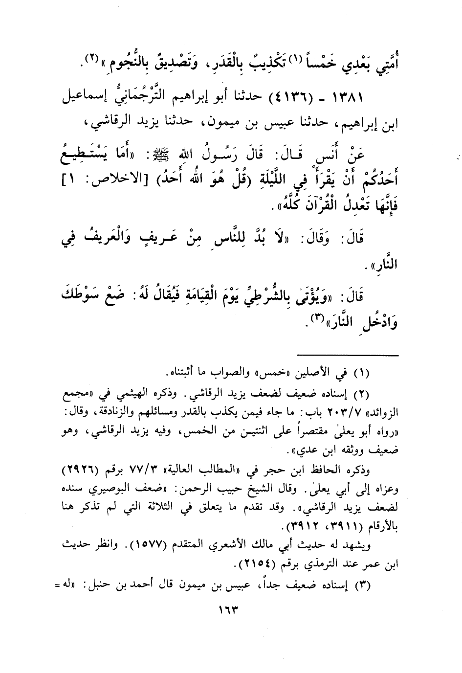 4136 - حَدَّثَنَا أَبُو إِبْرَاهِيمَ التَّرْجُمَانِيُّ إِسْمَاعِيلُ بْنُ إِبْرَاهِيمَ، حَدَّثَنَا عُبَيْسُ بْنُ مَيْمُونٍ، حَدَّثَنَا يَزِيدُ الرَّقَاشِيُّ، عَنْ أَنَسٍ قَالَ: قَالَ رَسُولُ اللَّهِ صَلَّى اللهُ عَلَيْهِ وَسَلَّمَ: «§أَمَا يَسْتَطِيعُ أَحَدُكُمْ أَنْ يَقْرَأَ فِي اللَّيْلَةِ قُلْ هُوَ اللَّهُ أَحَدٌ فَإِنَّهَا تَعْدِلُ الْقُرْآنَ كُلَّهُ» Kإسناده ضعيف جدا
