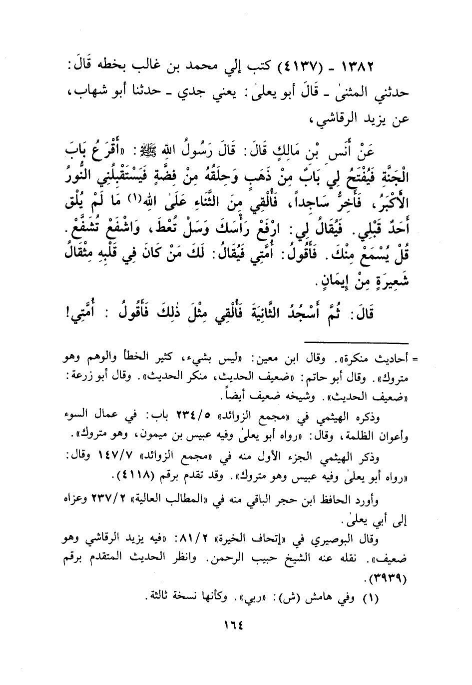 4137 - كَتَبَ إِلَيَّ مُحَمَّدُ بْنُ غَالِبٍ بِخَطِّهِ، قَالَ: حَدَّثَنِي الْمُثَنَّى، قَالَ أَبُو يَعْلَى ـ يَعْنِي جَدِّي ـ حَدَّثَنَا أَبُو شِهَابٍ، عَنْ يَزِيدَ الرَّقَاشِيِّ، عَنْ أَنَسِ بْنِ مَالِكٍ قَالَ: قَالَ رَسُولُ اللَّهِ صَلَّى اللهُ عَلَيْهِ وَسَلَّمَ: " §أَقْرَعُ بَابَ الْجَنَّةِ، فَيُفْتَحُ لِي بَابٌ مِنْ ذَهَبٍ وَحِلَقُةُ مِنْ فِضَّةٍ، فَيَسْتَقْبِلُنِي النُّورُ الْأَكْبَرُ، فَأَخِرُّ سَاجِدًا، فَأُلْقِي مِنَ الثَّنَاءِ عَلَى اللَّهِ مَا لَمْ يُلْقِ أَحَدٌ قَبْلِي، فَيُقَالُ لِي: ارْفَعْ رَأْسَكَ، وَسَلْ تُعْطَ، وَاشْفَعْ تُشَفَّعْ، قُلْ يُسْمَعْ مِنْكَ، فَأَقُولُ: أُمَّتِي، فَيُقَالُ: لَكَ مَنْ كَانَ فِي قَلْبِهِ مِثْقَالُ شَعِيرَةٍ مِنْ إِيمَانٍ، قَالَ: ثُمَّ أَسْجُدُ الثَّانِيَةَ، فَأُلْقِي مِثْلَ ذَلِكَ، فَأَقُولُ: أُمَّتِي، فَيُقَالُ لِي: لَكَ مَنْ كَانَ فِي قَلْبِهِ مِثْقَالُ حَبَّةٍ مِنْ خَرْدَلٍ مِنْ إِيمَانٍ، ثُمَّ أَسْجُدُ الثَّالِثَةَ، فَأُلْقِي مِثْلَ ذَلِكَ، فَيُقَالُ لِي مِثْلَ ذَلِكَ، ثُمَّ أَرْفَعُ رَأْسِي فَأَقُولُ: أُمَّتِي، فَيُقَالُ: لَكَ مَنْ قَالَ: لَا إِلَهَ إِلَّا اللَّهُ مُخْلِصًا "Kإسناده ضعيف
