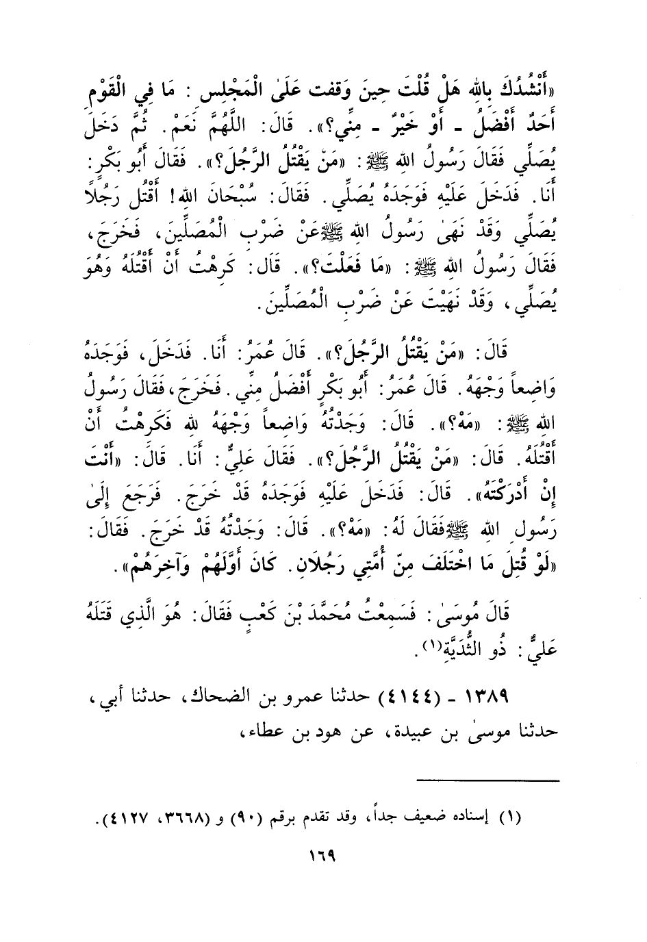 4144 - حَدَّثَنَا عَمْرُو بْنُ الضَّحَّاكِ، حَدَّثَنَا أَبِي، حَدَّثَنَا مُوسَى بْنُ عُبَيْدَةَ، عَنْ هُودِ بْنِ عَطَاءٍ، عَنْ أَنَسٍ، عَنْ أَبِي بَكْرٍ قَالَ: «§نَهَى رَسُولُ اللَّهِ صَلَّى اللهُ عَلَيْهِ وَسَلَّمَ عَنْ ضَرْبِ الْمُصَلِّينَ» Kإسناده ضعيف جدا