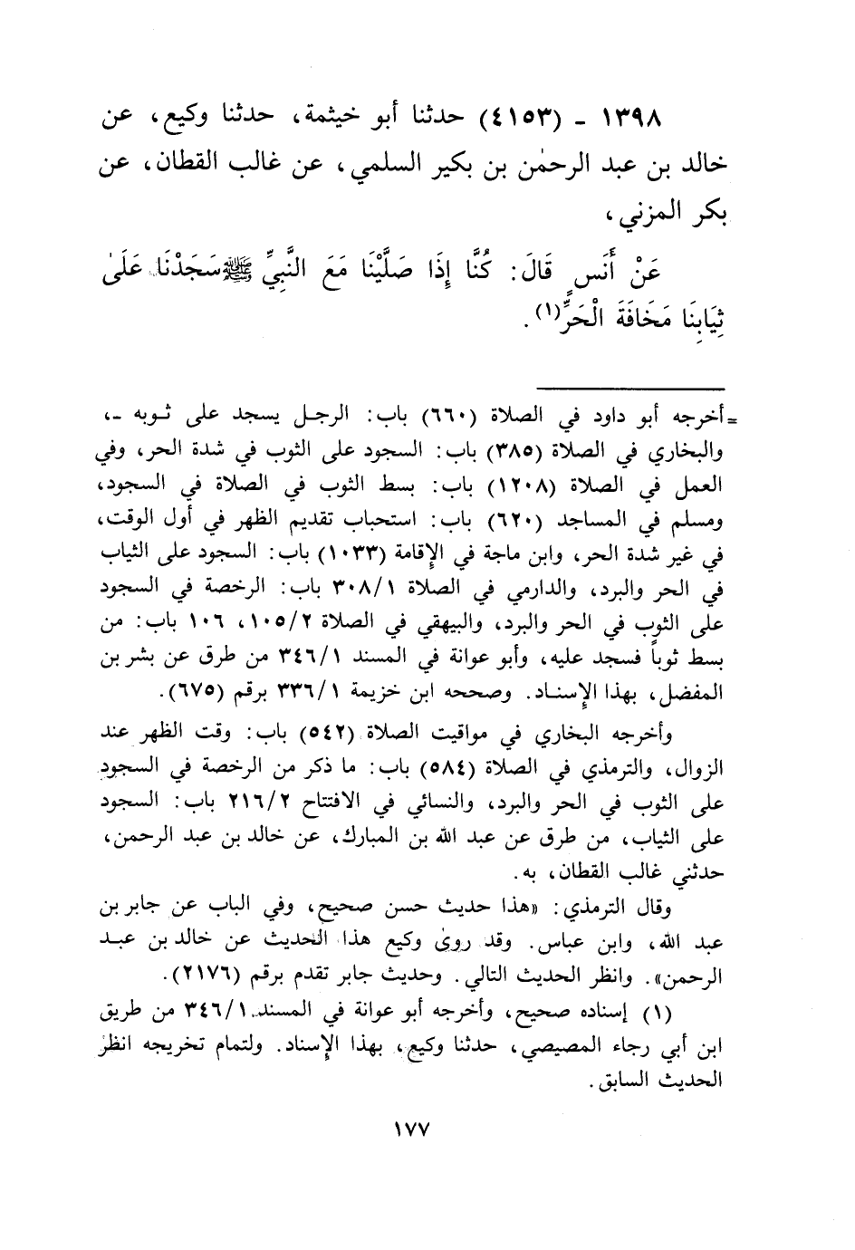 4153 - حَدَّثَنَا أَبُو خَيْثَمَةَ، حَدَّثَنَا وَكِيعٌ، عَنْ خَالِدِ بْنِ عَبْدِ الرَّحْمَنِ بْنِ بُكَيْرٍ السُّلَمِيِّ، عَنْ غَالِبٍ الْقَطَّانِ، عَنْ بَكْرٍ الْمُزَنِيِّ، عَنْ أَنَسٍ قَالَ: «§كُنَّا إِذَا صَلَّيْنَا مَعَ النَّبِيِّ صَلَّى اللهُ عَلَيْهِ وَسَلَّمَ سَجَدْنَا عَلَى ثِيَابِنَا مَخَافَةَ الْحَرِّ» Kإسناده صحيح