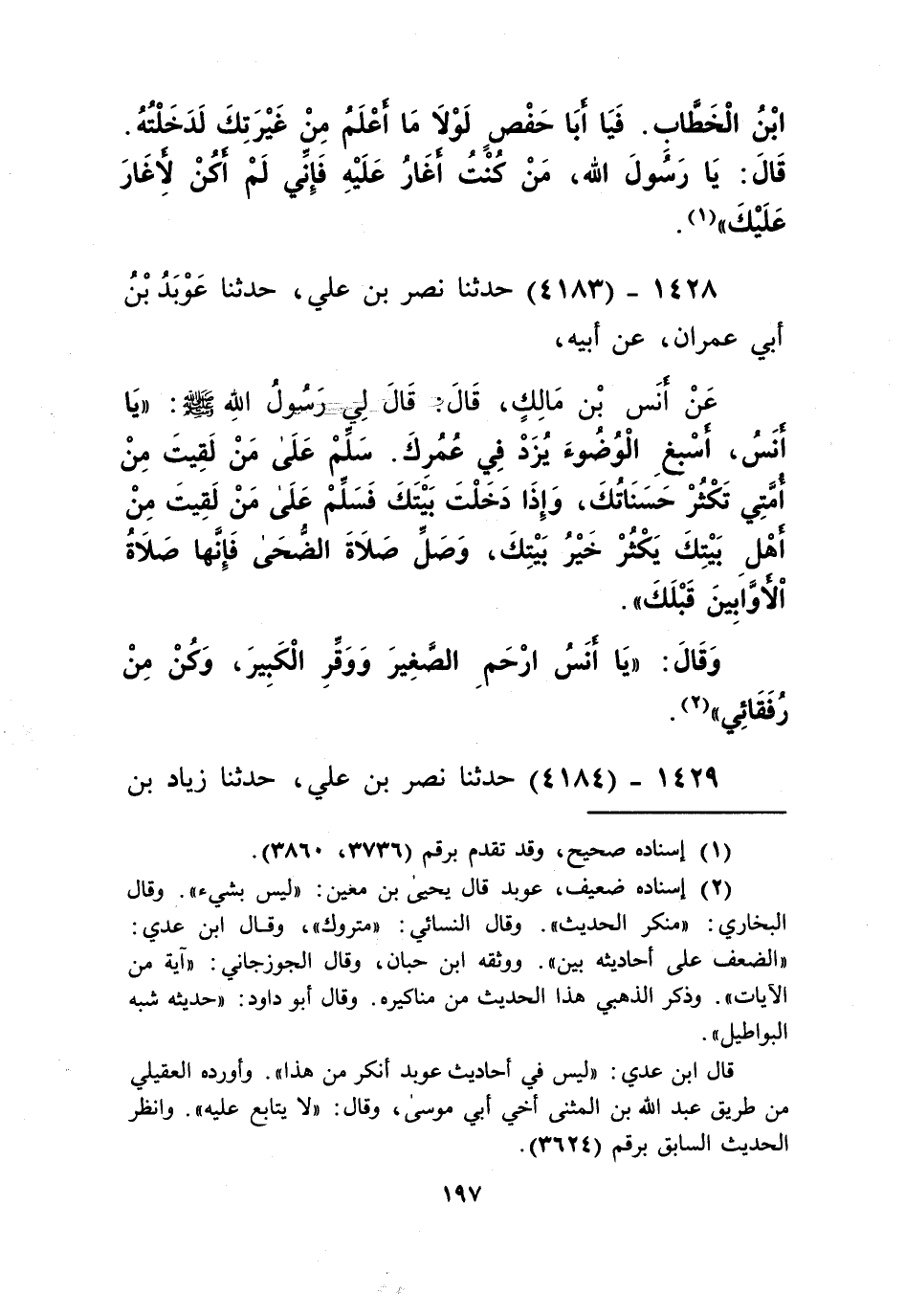 4183 - حَدَّثَنَا نَصْرُ بْنُ عَلِيٍّ، حَدَّثَنَا عَوْبَدُ بْنُ أَبِي عِمْرَانَ، عَنْ أَبِيهِ، عَنْ أَنَسِ بْنِ مَالِكٍ قَالَ: قَالَ لِي رَسُولُ اللَّهِ صَلَّى اللهُ عَلَيْهِ وَسَلَّمَ: «يَا أَنَسُ، §أَسْبِغِ الْوُضُوءَ يُزَدْ فِي عُمُرِكَ، سَلِّمْ عَلَى مَنْ لَقِيتَ مِنْ أُمَّتِي تَكْثُرْ حَسَنَاتُكَ، وَإِذَا دَخَلْتَ بَيْتَكَ فَسَلِّمْ عَلَى مَنْ لَقِيتَ مِنْ أَهْلِ بَيْتِكَ يَكْثُرْ خَيْرُ بَيْتِكَ، وَصَلِّ صَلَاةَ الضُّحَى؛ فَإِنَّهَا صَلَاةُ الْأَوَّابِينَ قَبْلَكَ»، وَقَالَ: «يَا أَنَسُ، ارْحَمِ الصَّغِيرَ، وَوَقِّرِ الْكَبِيرَ، وَكُنْ مِنْ رُفَقَائِي» Kإسناده ضعيف