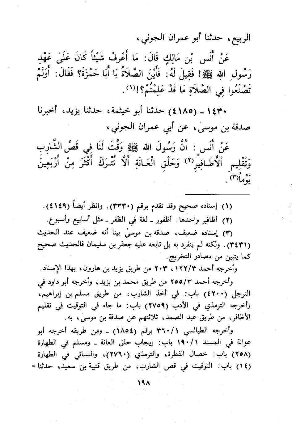 4185 - حَدَّثَنَا أَبُو خَيْثَمَةَ، حَدَّثَنَا يَزِيدُ، أَخْبَرَنَا صَدَقَةُ بْنُ مُوسَى، عَنْ أَبِي عِمْرَانَ الْجَوْنِيِّ، عَنْ أَنَسٍ، «أَنَّ رَسُولَ اللَّهِ صَلَّى اللهُ عَلَيْهِ وَسَلَّمَ §وَقَّتَ لَنَا فِي قَصِّ الشَّارِبِ، وَتَقْلِيمِ الْأَظَافِيرِ، وَحَلْقِ الْعَانَةِ أَلَّا تُتْرَكَ أَكْثَرَ مِنْ أَرْبَعِينَ يَوْمًا» Kإسناده ضعيف