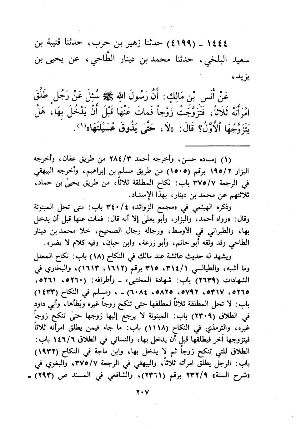 4199 - حَدَّثَنَا زُهَيْرُ بْنُ حَرْبٍ، حَدَّثَنَا قُتَيْبَةُ بْنُ سَعِيدٍ الْبَلْخِيُّ، حَدَّثَنَا مُحَمَّدُ بْنُ دِينَارٍ الطَّاحِيُّ، عَنْ يَحْيَى بْنِ يَزِيدَ، عَنْ أَنَسِ بْنِ مَالِكٍ، أَنَّ رَسُولَ اللَّهِ صَلَّى اللهُ عَلَيْهِ وَسَلَّمَ سُئِلَ عَنْ رَجُلٍ طَلَّقَ امْرَأَتَهُ ثَلَاثًا، فَتَزَوَّجَتْ زَوْجًا فَمَاتَ عَنْهَا قَبْلَ أَنْ يَدْخُلَ بِهَا، هَلْ يَتَزَوَّجُهَا الْأَوَّلُ؟ قَالَ: «لَا، §حَتَّى يَذُوقَ عُسَيْلَتَهَا»،