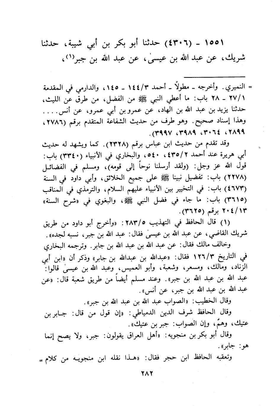 4306 - حَدَّثَنَا أَبُو بَكْرِ بْنُ أَبِي شَيْبَةَ، حَدَّثَنَا شَرِيكٌ، عَنْ عَبْدِ اللَّهِ بْنِ عِيسَى، عَنْ عَبْدِ اللَّهِ بْنِ جَبْرٍ -[283]-، عَنْ أَنَسٍ قَالَ: كَانَ شَابٌّ يَهُودِيٌّ يَخْدُمُ النَّبِيَّ صَلَّى اللهُ عَلَيْهِ وَسَلَّمَ، فَمَرِضَ، فَأَتَاهُ النَّبِيُّ صَلَّى اللهُ عَلَيْهِ وَسَلَّمَ يَعُودُهُ فَقَالَ: «§أَتَشْهَدُ أَنْ لَا إِلَهَ إِلَّا اللَّهُ، وَأَنِّي رَسُولُ اللَّهِ؟»، قَالَ: فَجَعَلَ يَنْظُرُ إِلَى أَبِيهِ، فَقَالَ لَهُ: قُلْ كَمَا يَقُولُ لَكَ مُحَمَّدٌ، فَقَالَ: فَقَبِلَ ثُمَّ مَاتَ، فَقَالَ النَّبِيُّ صَلَّى اللهُ عَلَيْهِ وَسَلَّمَ لِأَصْحَابِهِ: «صَلَّوْا عَلَى صَاحِبِكُمْ» Kإسناده ضعيف