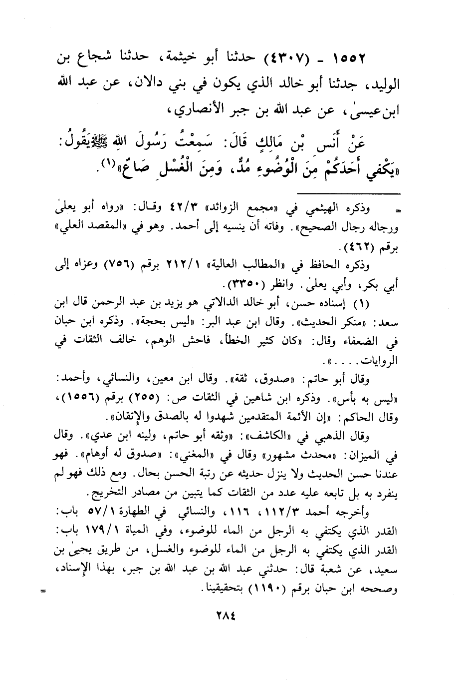 4307 - حَدَّثَنَا أَبُو خَيْثَمَةَ، حَدَّثَنَا شُجَاعُ بْنُ الْوَلِيدِ، حَدَّثَنَا أَبُو خَالِدٍ الَّذِي يَكُونُ فِي بَنِي دَالَانَ، عَنْ عَبْدِ اللَّهِ بْنِ عِيسَى، عَنْ عَبْدِ اللَّهِ بْنِ جَبْرٍ الْأَنْصَارِيِّ، عَنْ أَنَسِ بْنِ مَالِكٍ قَالَ: سَمِعْتُ رَسُولَ اللَّهِ صَلَّى اللهُ عَلَيْهِ وَسَلَّمَ يَقُولُ: «§يَكْفِي أَحَدَكُمْ مِنَ الْوُضُوءِ مُدٌّ، وَمَنَ الْغُسْلِ صَاعٌ» Kإسناده حسن