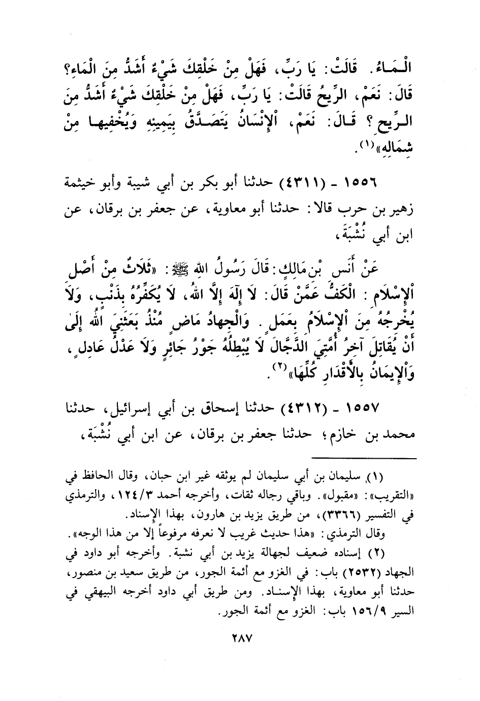 4311 - حَدَّثَنَا أَبُو بَكْرِ بْنُ أَبِي شَيْبَةَ، وَأَبُو خَيْثَمَةَ زُهَيْرُ بْنُ حَرْبٍ، قَالَا: حَدَّثَنَا أَبُو مُعَاوِيَةَ، عَنْ جَعْفَرِ بْنِ بُرْقَانَ، عَنِ ابْنِ أَبِي نُشْبَةَ، عَنْ أَنَسِ بْنِ مَالِكٍ، قَالَ رَسُولُ اللَّهِ صَلَّى اللهُ عَلَيْهِ وَسَلَّمَ: " §ثَلَاثٌ مِنْ أَصْلِ الْإِسْلَامِ: الْكَفُّ عَمَّنْ قَالَ: لَا إِلَهَ إِلَّا اللَّهُ، لَا يُكَفِّرُهُ بِذَنْبٍ، وَلَا يُخْرِجُهُ مِنَ الْإِسْلَامِ بِعَمَلٍ، وَالْجِهَادُ مَاضٍ مُنْذُ بَعَثَنِي اللَّهُ إِلَى أَنْ يُقَاتِلَ آخِرُ أُمَّتِي الدَّجَّالَ لَا يُبْطِلُهُ جَوْرُ جَائِرٍ وَلَا عَدْلُ عَادِلٍ، وَالْإِيمَانُ بِالْأَقْدَارِ كُلِّهَا "Kإسناده ضعيف