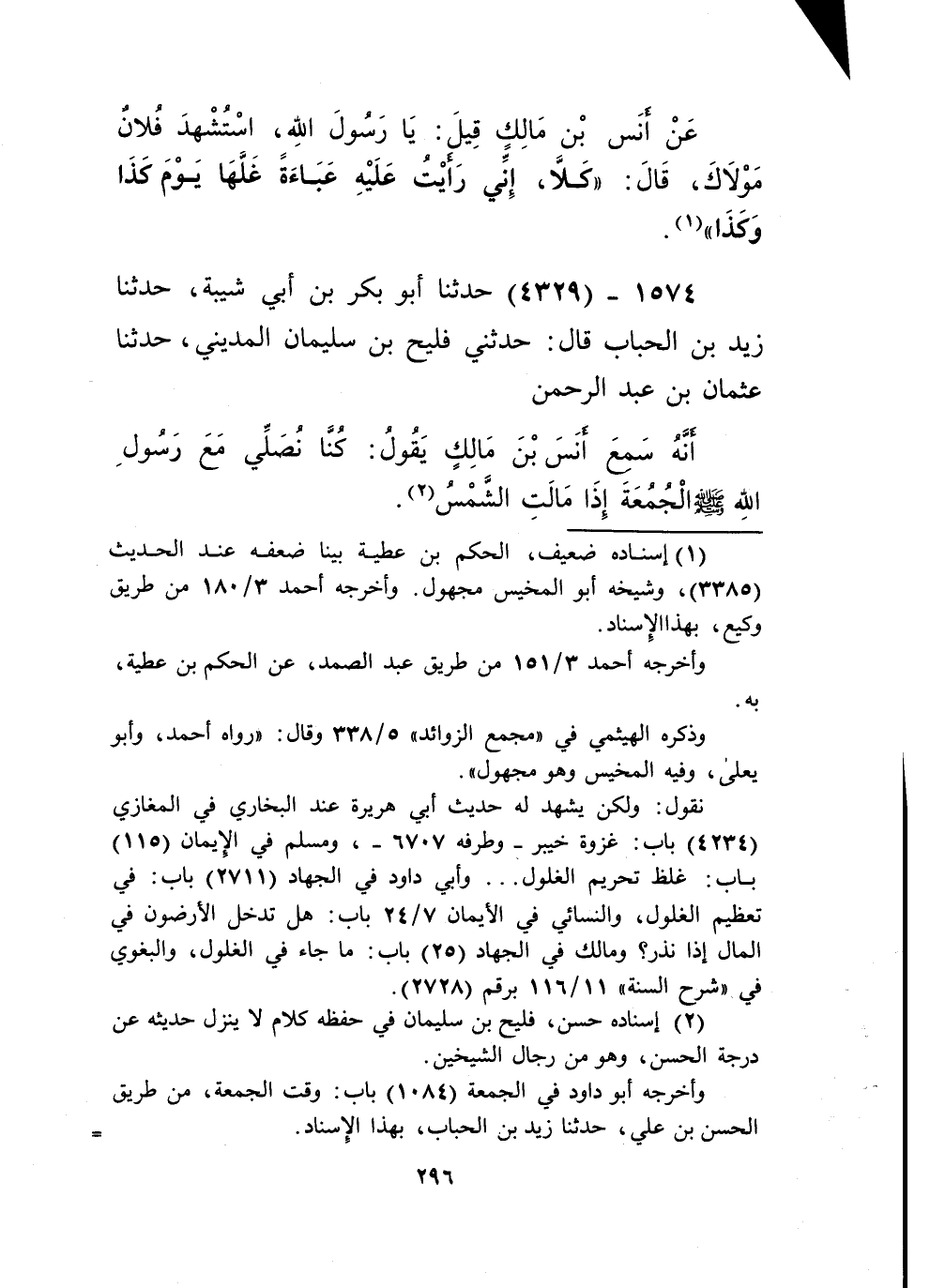 4329 - حَدَّثَنَا أَبُو بَكْرِ بْنُ أَبِي شَيْبَةَ، حَدَّثَنَا زَيْدُ بْنُ الْحُبَابِ، قَالَ: حَدَّثَنِي فُلَيْحُ بْنُ سُلَيْمَانَ الْمَدِينِيُّ، حَدَّثَنَا عُثْمَانُ بْنُ عَبْدِ الرَّحْمَنِ، أَنَّهُ سَمِعَ أَنَسَ بْنَ مَالِكٍ يَقُولُ: «§كُنَّا نُصَلِّي مَعَ رَسُولِ اللَّهِ صَلَّى اللهُ عَلَيْهِ وَسَلَّمَ الْجُمُعَةَ إِذَا مَالَتِ الشَّمْسُ» Kإسناده حسن