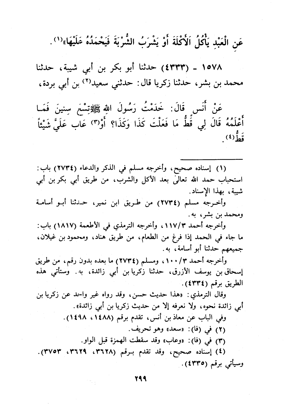 4333 - حَدَّثَنَا أَبُو بَكْرِ بْنُ أَبِي شَيْبَةَ، حَدَّثَنَا مُحَمَّدُ بْنُ بِشْرٍ، حَدَّثَنَا زَكَرِيَّا قَالَ: حَدَّثَنِي سَعِيدُ بْنُ أَبِي بُرْدَةَ، عَنْ أَنَسٍ قَالَ: " §خَدَمْتُ رَسُولَ اللَّهِ صَلَّى اللهُ عَلَيْهِ وَسَلَّمَ تِسْعَ سِنِينَ، فَمَا أَعْلَمُهُ قَالَ لِي قَطُّ: مَا فَعَلْتَ كَذَا وَكَذَا، أَوْ عَابَ عَلَيَّ شَيْئًا قَطُّ "Kإسناده صحيح