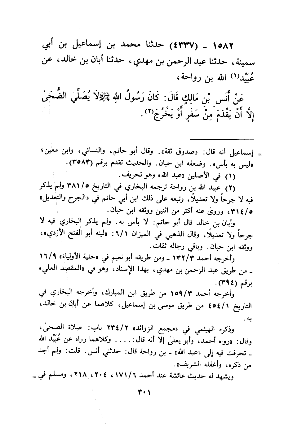 4337 - حَدَّثَنَا مُحَمَّدُ بْنُ إِسْمَاعِيلَ بْنِ أَبِي سَمِينَةَ، حَدَّثَنَا عَبْدُ الرَّحْمَنِ بْنُ مَهْدِيٍّ، حَدَّثَنَا أَبَانُ بْنُ خَالِدٍ، عَنْ عُبَيْدِ اللَّهِ بْنِ رَوَاحَةَ، عَنْ أَنَسِ بْنِ مَالِكٍ قَالَ: «كَانَ رَسُولُ اللَّهِ صَلَّى اللهُ عَلَيْهِ وَسَلَّمَ §لَا يُصَلِّي الضُّحَى إِلَّا أَنْ يَقْدَمَ مِنْ سَفَرٍ أَوْ يَخْرُجَ»