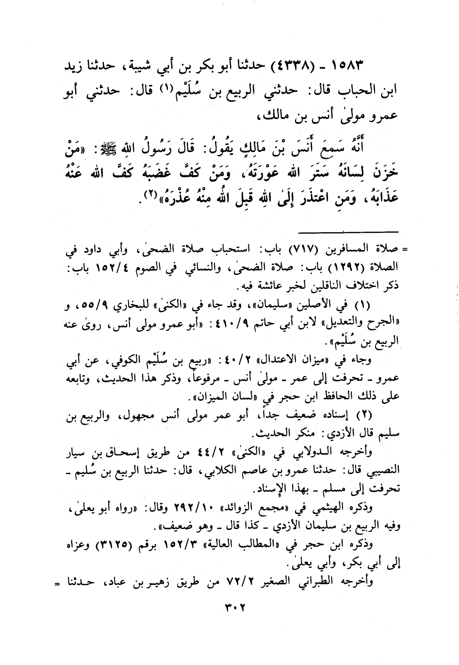 4338 - حَدَّثَنَا أَبُو بَكْرِ بْنُ أَبِي شَيْبَةَ، حَدَّثَنَا زَيْدُ بْنُ الْحُبَابِ، قَالَ: حَدَّثَنِي الرَّبِيعُ بْنُ سُلَيْمٍ، قَالَ: حَدَّثَنِي أَبُو عَمْرٍو، مَوْلَى أَنَسِ بْنِ مَالِكٍ، أَنَّهُ سَمِعَ أَنَسَ بْنَ مَالِكٍ يَقُولُ: قَالَ رَسُولُ اللَّهِ صَلَّى اللهُ عَلَيْهِ وَسَلَّمَ: «§مَنْ خَزَنَ لِسَانَهُ سَتَرَ اللَّهُ عَوْرَتَهُ، وَمَنْ كَفَّ غَضَبَهُ كَفَّ اللَّهُ عَنْهُ عَذَابَهُ، وَمَنِ اعْتَذَرَ إِلَى اللَّهِ قَبِلَ اللَّهُ مِنْهُ عُذْرَهُ» Kإسناده ضعيف جدا