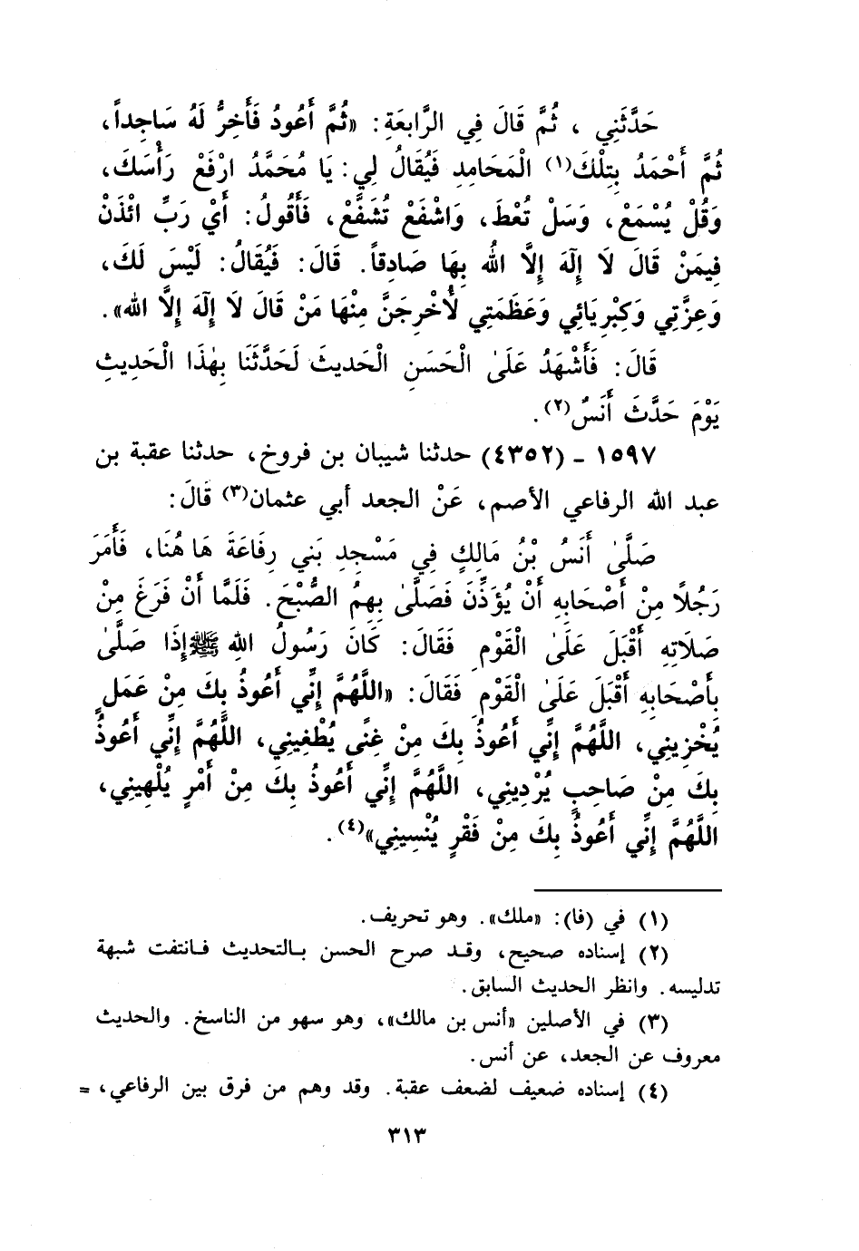 4352 - حَدَّثَنَا شَيْبَانُ بْنُ فَرُّوخَ، حَدَّثَنَا عُقْبَةُ بْنُ عَبْدِ اللَّهِ الرِّفَاعِيُّ الْأَصَمُّ، عَنِ الْجَعْدِ أَبِي عُثْمَانَ، قَالَ: صَلَّى أَنَسُ بْنُ مَالِكٍ فِي مَسْجِدِ بَنِي رِفَاعَةَ هَا هُنَا، فَأَمَرَ رَجُلًا مِنْ أَصْحَابِهِ أَنْ يُؤَذِّنَ، فَصَلَّى بِهِمُ الصُّبْحَ، فَلَمَّا أَنْ فَرَغَ مِنْ صَلَاتِهِ أَقْبَلَ عَلَى الْقَوْمِ فَقَالَ: كَانَ رَسُولُ اللَّهِ صَلَّى اللهُ عَلَيْهِ وَسَلَّمَ إِذَا صَلَّى بِأَصْحَابِهِ أَقْبَلَ عَلَى الْقَوْمِ فَقَالَ: «§اللَّهُمَّ إِنِّي أَعُوذُ بِكَ مِنْ عَمَلٍ يُخْزِينِي، اللَّهُمَّ إِنِّي أَعُوذُ بِكَ مِنْ غِنًى يُطْغِينِي، اللَّهُمَّ إِنِّي أَعُوذُ بِكَ مِنْ صَاحِبٍ يُرْدِينِي، اللَّهُمَّ إِنِّي أَعُوذُ بِكَ مِنْ أَمْرٍ يُلْهِينِي، اللَّهُمَّ إِنِّي أَعُوذُ بِكَ مِنْ فَقْرٍ يُنْسِينِي» Kإسناده ضعيف