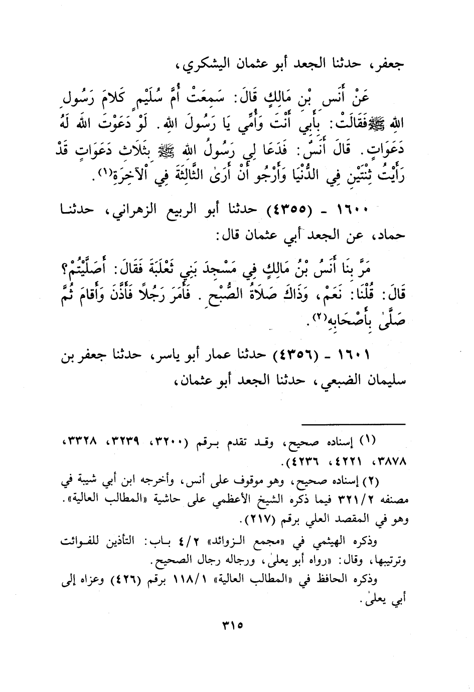 4355 - حَدَّثَنَا أَبُو الرَّبِيعِ الزَّهْرَانِيُّ، حَدَّثَنَا حَمَّادٌ، عَنِ الْجَعْدِ أَبِي عُثْمَانَ قَالَ: مَرَّ بِنَا أَنَسُ بْنُ مَالِكٍ فِي مَسْجِدِ بَنِي ثَعْلَبَةَ فَقَالَ: «§أَصَلَّيْتُمْ؟»، قَالَ: قُلْنَا: نَعَمْ، وَذَاكَ صَلَاةُ الصُّبْحِ، «فَأَمَرَ رَجُلًا فَأَذَّنَ وَأَقَامَ ثُمَّ صَلَّى بِأَصْحَابِهِ» Kإسناده صحيح