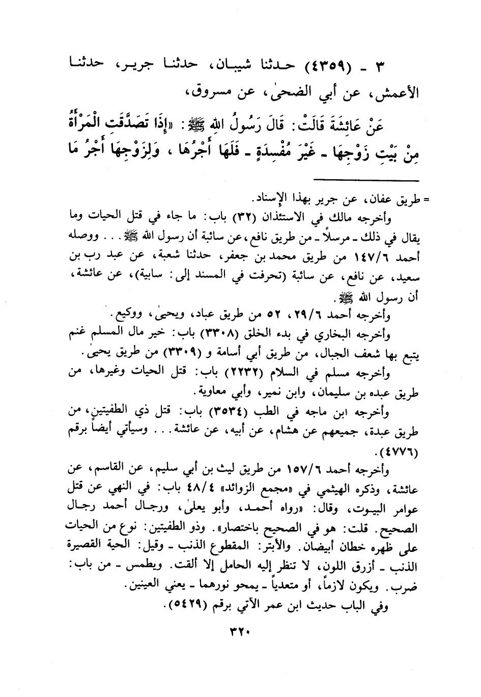 4359 - حَدَّثَنَا شَيْبَانُ، حَدَّثَنَا جَرِيرٌ، حَدَّثَنَا الْأَعْمَشُ، عَنْ أَبِي الضُّحَى، عَنْ مَسْرُوقٍ، عَنْ عَائِشَةَ قَالَتْ: قَالَ رَسُولُ اللَّهِ صَلَّى اللهُ عَلَيْهِ وَسَلَّمَ: «§إِذَا تَصَدَّقَتِ الْمَرْأَةُ مِنْ بَيْتِ زَوْجِهَا غَيْرَ مُفْسِدَةٍ فَلَهَا أَجْرُهَا، وَلِزَوْجِهَا أَجْرُ مَا -[321]- اكْتَسَبَ، وَلَهَا أَجْرُ مَا نَوَتْ، وَلِلْخَازِنِ مِثْلُ ذَلِكَ» Kإسناده صحيح