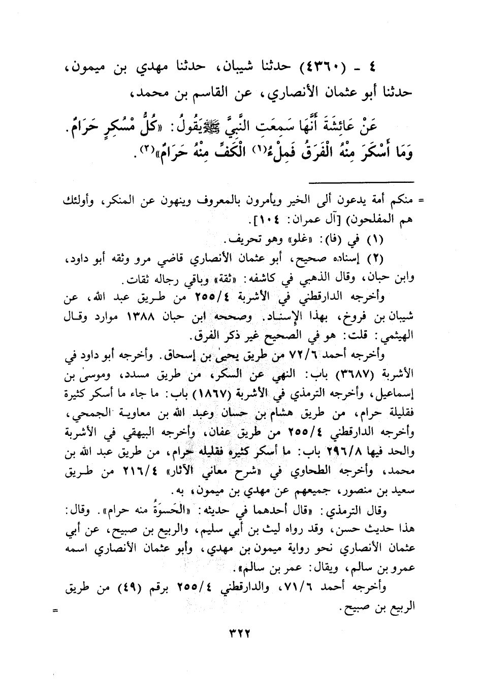 4360 - حَدَّثَنَا شَيْبَانُ، حَدَّثَنَا مَهْدِيُّ بْنُ مَيْمُونٍ، حَدَّثَنَا أَبُو عُثْمَانَ الْأَنْصَارِيُّ، عَنِ الْقَاسِمِ بْنِ مُحَمَّدٍ، عَنْ عَائِشَةَ، أَنَّهَا سَمِعَتِ النَّبِيَّ صَلَّى اللهُ عَلَيْهِ وَسَلَّمَ يَقُولُ: «§كُلُّ مُسْكِرٍ حَرَامٌ، وَمَا أَسْكَرَ مِنْهُ الْفَرَقُ فَمِلْءُ الْكَفِّ مِنْهُ حَرَامٌ» Kإسناده صحيح