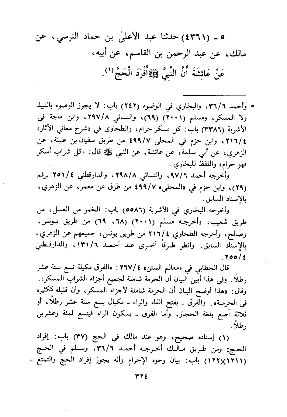4361 - حَدَّثَنَا عَبْدُ الْأَعْلَى بْنُ حَمَّادٍ النَّرْسِيُّ، عَنْ مَالِكٍ، عَنْ عَبْدِ الرَّحْمَنِ بْنِ الْقَاسِمِ، عَنْ أَبِيهِ، عَنْ عَائِشَةَ، «§أَنَّ النَّبِيَّ صَلَّى اللهُ عَلَيْهِ وَسَلَّمَ أَفْرَدَ الْحَجَّ» Kإسناده صحيح