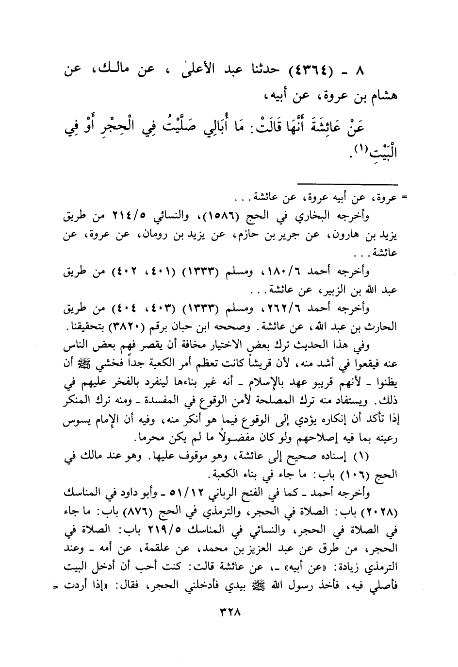 4364 - حَدَّثَنَا عَبْدُ الْأَعْلَى، عَنْ مَالِكٍ، عَنْ هِشَامِ بْنِ عُرْوَةَ، عَنْ أَبِيهِ، عَنْ عَائِشَةَ أَنَّهَا قَالَتْ: «§مَا أُبَالِي، صَلَّيْتُ فِي الْحِجْرِ أَوْ فِي الْبَيْتِ» Kإسناده صحيح