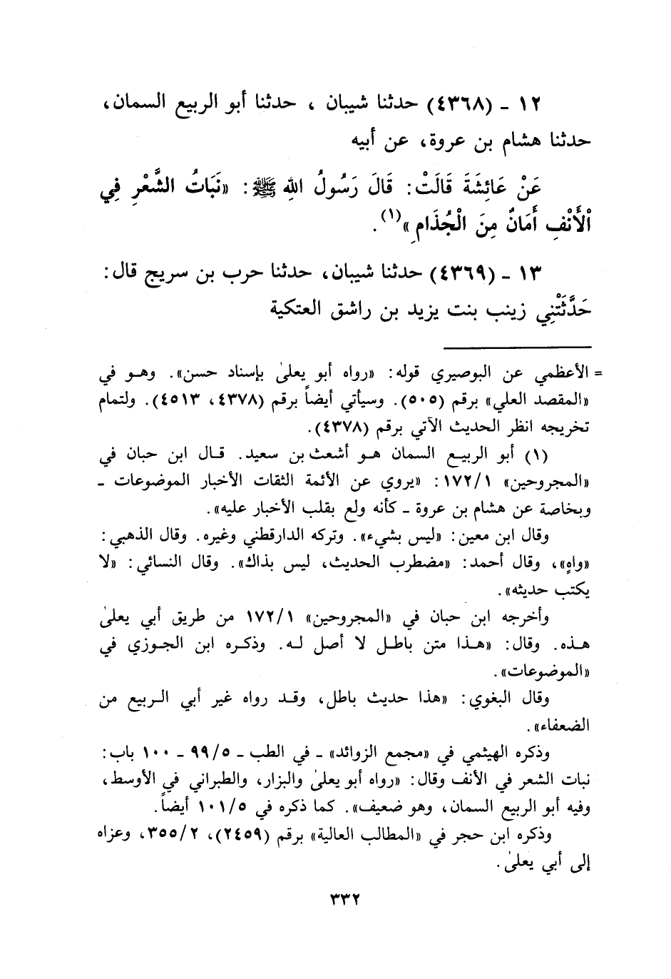 4368 - حَدَّثَنَا شَيْبَانُ، حَدَّثَنَا أَبُو الرَّبِيعِ السَّمَّانُ، حَدَّثَنَا هِشَامُ بْنُ عُرْوَةَ، عَنْ أَبِيهِ، عَنْ عَائِشَةَ قَالَتْ: قَالَ رَسُولُ اللَّهِ صَلَّى اللهُ عَلَيْهِ وَسَلَّمَ: «§نَبَاتُ الشَّعْرِ فِي الْأَنْفِ أَمَانٌ مِنَ الْجُذَامِ»