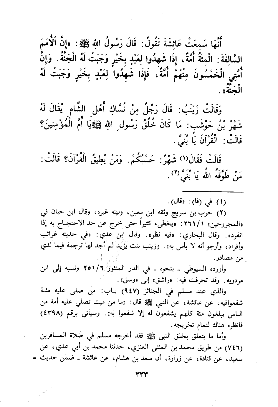 وَقَالَتْ زَيْنَبُ: قَالَ رَجُلٌ مِنْ نُسَّاكِ أَهْلِ الشَّامِ يُقَالُ لَهُ شَهْرُ بْنُ حَوْشَبٍ: §مَا كَانَ خُلُقُ رَسُولِ اللَّهِ صَلَّى اللهُ عَلَيْهِ وَسَلَّمَ يَا أُمَّ الْمُؤْمِنِينَ؟ قَالَتْ: «الْقُرْآنُ يَا بُنَيَّ»، قَالَتْ: فَقَالَ شَهْرٌ: حَسْبُكُمْ، وَمَنْ يُطِيقُ الْقُرْآنَ؟ قَالَتْ: مَنْ طَوَّقَهُ اللَّهُ يَا بُنَيَّ