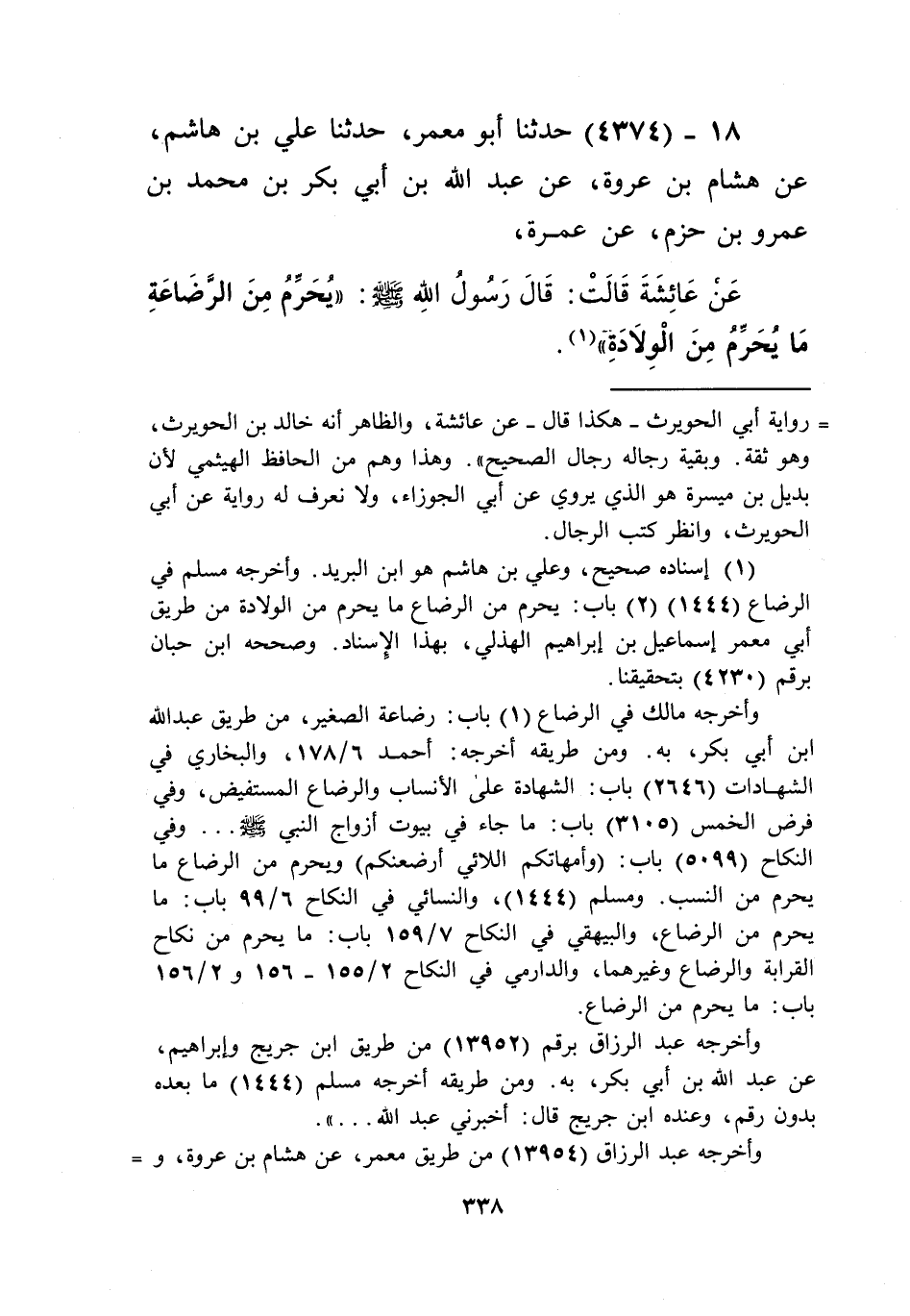 4374 - حَدَّثَنَا أَبُو مَعْمَرٍ، حَدَّثَنَا عَلِيُّ بْنُ هَاشِمٍ، عَنْ هِشَامِ بْنِ عُرْوَةَ، عَنْ عَبْدِ اللَّهِ بْنِ أَبِي بَكْرِ بْنِ مُحَمَّدِ بْنِ عَمْرِو بْنِ حَزْمٍ، عَنْ عَمْرَةَ، عَنْ عَائِشَةَ قَالَتْ: قَالَ رَسُولُ اللَّهِ صَلَّى اللهُ عَلَيْهِ وَسَلَّمَ: «§يَحْرُمُ مِنَ الرَّضَاعَةِ مَا يَحْرُمُ مِنَ الْوِلَادَةِ» Kإسناده صحيح