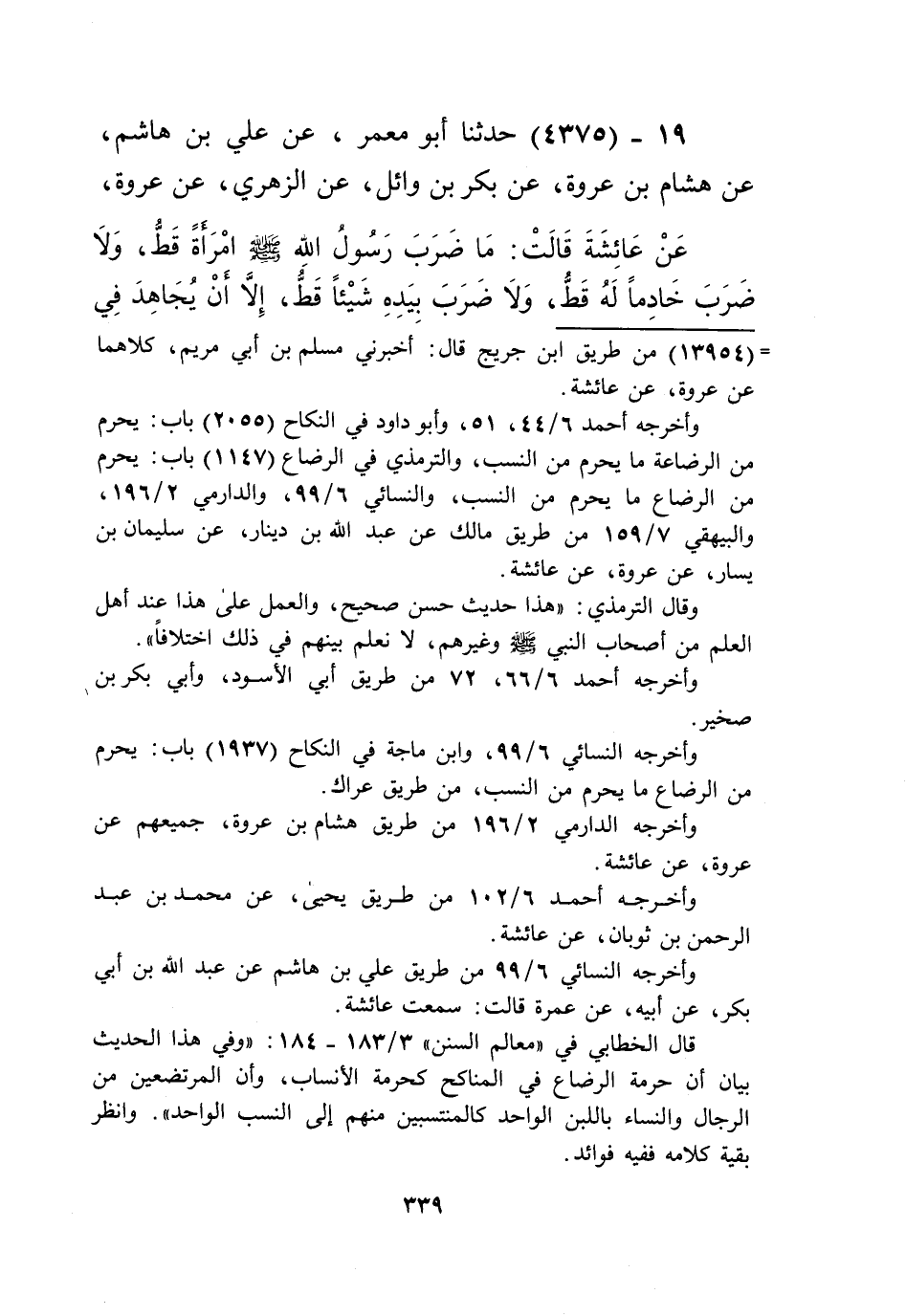 4375 - حَدَّثَنَا أَبُو مَعْمَرٍ، عَنْ عَلِيِّ بْنِ هَاشِمٍ، عَنْ هِشَامِ بْنِ عُرْوَةَ، عَنْ بَكْرِ بْنِ وَائِلٍ، عَنِ الزُّهْرِيِّ، عَنْ عُرْوَةَ، عَنْ عَائِشَةَ قَالَتْ: «§مَا ضَرَبَ رَسُولُ اللَّهِ صَلَّى اللهُ عَلَيْهِ وَسَلَّمَ امْرَأَةً قَطُّ، وَلَا ضَرَبَ خَادِمًا لَهُ قَطُّ، وَلَا ضَرَبَ بِيَدِهِ شَيْئًا قَطُّ، إِلَّا أَنْ يُجَاهِدَ فِي سَبِيلِ اللَّهِ، وَمَا نِيلَ مِنْهُ شَيْءٌ فَانْتَقَمَهُ مِنْ صَاحِبِهِ إِلَّا أَنْ تُنْتَهَكَ مَحَارِمُ اللَّهِ فَيَنْتَقِمُ» Kإسناده صحيح