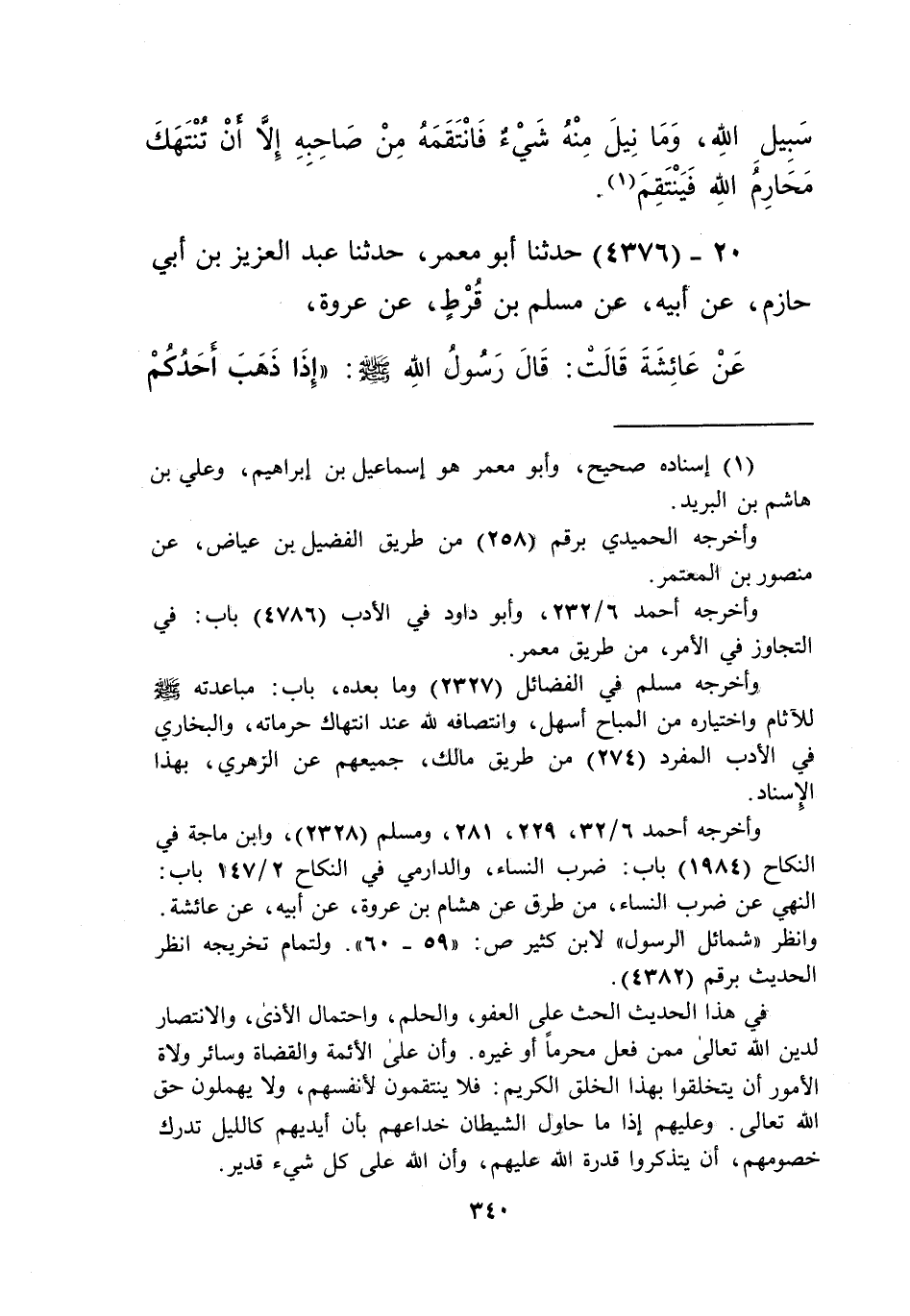 4376 - حَدَّثَنَا أَبُو مَعْمَرٍ، حَدَّثَنَا عَبْدُ الْعَزِيزِ بْنُ أَبِي حَازِمٍ، عَنْ أَبِيهِ، عَنْ مُسْلِمِ بْنِ قُرْطٍ، عَنْ عُرْوَةَ، عَنْ عَائِشَةَ قَالَتْ: قَالَ رَسُولُ اللَّهِ صَلَّى اللهُ عَلَيْهِ وَسَلَّمَ: «§إِذَا ذَهَبَ أَحَدُكُمْ إِلَى الْخَلَاءِ فَلْيَسْتَطِبْ بِثَلَاثَةِ أَحْجَارٍ، فَإِنَّهَا تُجْزِئُهُ» Kإسناده حسن