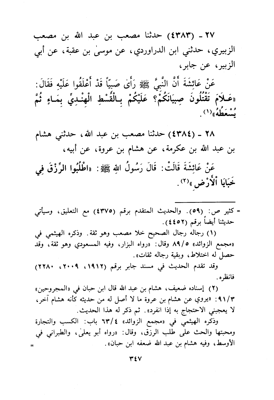 4384 - حَدَّثَنَا مُصْعَبُ بْنُ عَبْدِ اللَّهِ، حَدَّثَنِي هِشَامُ بْنُ عَبْدِ اللَّهِ بْنِ عِكْرِمَةَ، عَنْ هِشَامِ بْنِ عُرْوَةَ، عَنْ أَبِيهِ، عَنْ عَائِشَةَ قَالَتْ: قَالَ رَسُولُ اللَّهِ صَلَّى اللهُ عَلَيْهِ وَسَلَّمَ: «§اطْلُبُوا الرِّزْقَ فِي خَبَايَا الْأَرْضِ» Kإسناده ضعيف