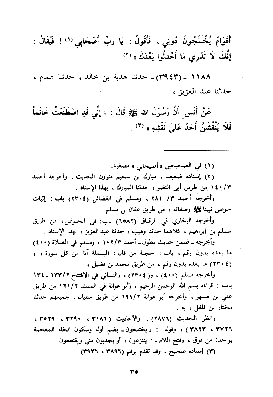 3943 - حَدَّثَنَا هُدْبَةُ بْنُ خَالِدٍ، حَدَّثَنَا هَمَّامٌ، حَدَّثَنَا عَبْدُ الْعَزِيزِ، عَنْ أَنَسٍ، أَنَّ رَسُولَ اللَّهِ صَلَّى اللهُ عَلَيْهِ وَسَلَّمَ قَالَ: «إِنِّي §قَدِ اصْطَنَعْتُ خَاتَمًا، فَلَا يَنْقُشَنَّ أَحَدٌ عَلَى نَقْشِهِ» Kإسناده صحيح