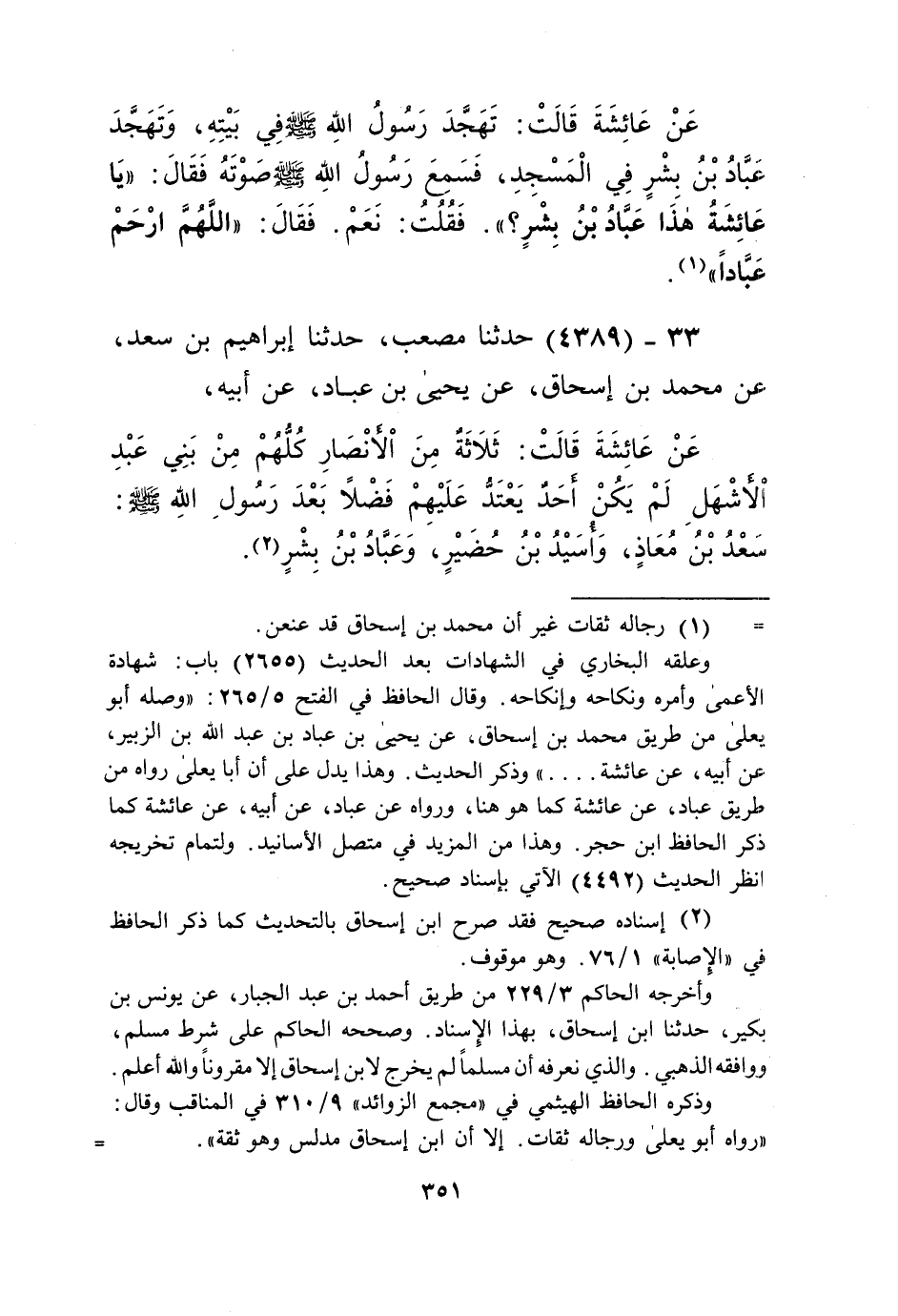 4389 - حَدَّثَنَا مُصْعَبٌ، حَدَّثَنَا إِبْرَاهِيمُ بْنُ سَعْدٍ، عَنْ مُحَمَّدِ بْنِ إِسْحَاقَ، عَنْ يَحْيَى بْنِ عَبَّادٍ، عَنْ أَبِيهِ، عَنْ عَائِشَةَ قَالَتْ: " §ثَلَاثَةٌ مِنَ الْأَنْصَارِ كُلُّهُمْ مِنْ بَنِي عَبْدِ الْأَشْهَلِ لَمْ يَكُنْ أَحَدٌ يَعْتَدُّ عَلَيْهِمْ فَضْلًا بَعْدَ رَسُولِ اللَّهِ صَلَّى اللهُ عَلَيْهِ وَسَلَّمَ: سَعْدُ بْنُ مُعَاذٍ، وَأُسَيْدُ بْنُ حُضَيْرٍ، وَعَبَّادُ بْنُ بِشْرٍ "Kإسناده صحيح