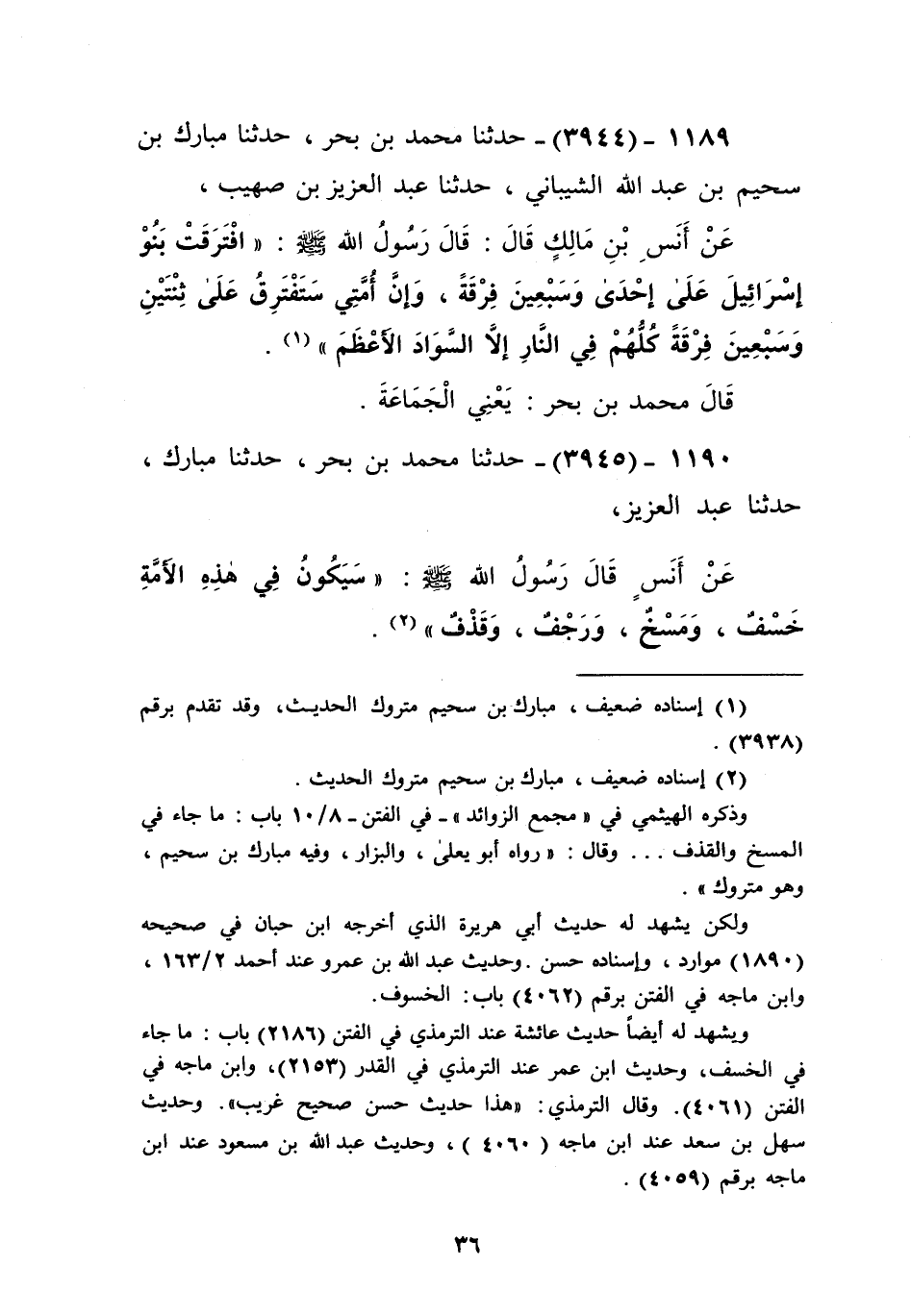 3944 - حَدَّثَنَا مُحَمَّدُ بْنُ بَحْرٍ، حَدَّثَنَا مُبَارَكُ بْنُ سُحَيْمِ بْنِ عَبْدِ اللَّهِ الشَّيْبَانِيُّ، حَدَّثَنَا عَبْدُ الْعَزِيزِ بْنُ صُهَيْبٍ، عَنْ أَنَسِ بْنِ مَالِكٍ قَالَ: قَالَ رَسُولُ اللَّهِ صَلَّى اللهُ عَلَيْهِ وَسَلَّمَ: «§افْتَرَقَتْ بَنُو إِسْرَائِيلَ عَلَى إِحْدَى وَسَبْعِينَ فِرْقَةً، وَإِنَّ أُمَّتِي سَتَفْتَرِقُ عَلَى ثِنْتَيْنِ وَسَبْعِينَ فِرْقَةً، كُلُّهُمْ فِي النَّارِ إِلَّا السَّوَادَ الْأَعْظَمَ»، قَالَ مُحَمَّدُ بْنُ بَحْرٍ: يَعْنِي الْجَمَاعَةَKإسناده ضعيف