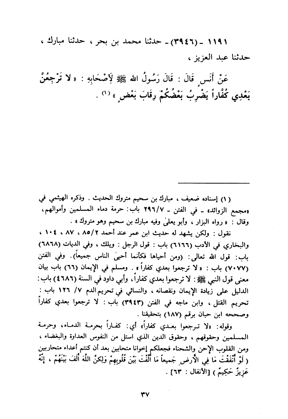 3946 - حَدَّثَنَا مُحَمَّدُ بْنُ بَحْرٍ، حَدَّثَنَا مُبَارَكٌ، حَدَّثَنَا عَبْدُ الْعَزِيزِ، عَنْ أَنَسٍ قَالَ: قَالَ رَسُولُ اللَّهِ صَلَّى اللهُ عَلَيْهِ وَسَلَّمَ لِأَصْحَابِهِ: «§لَا تَرْجِعُنَّ بَعْدِي كُفَّارًا يَضْرِبُ بَعْضُكُمْ رِقَابَ بَعْضٍ» Kإسناده ضعيف