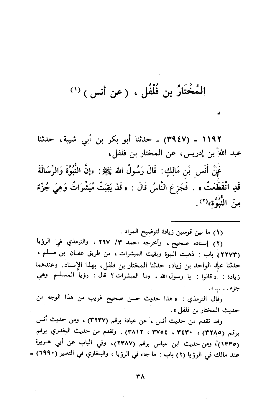 3947 - حَدَّثَنَا أَبُو بَكْرِ بْنِ أَبِي شَيْبَةَ، حَدَّثَنَا عَبْدُ اللَّهِ بْنُ إِدْرِيسَ، عنِ الْمُخْتَارِ بْنِ فُلْفُلٍ، عَنْ أَنَسِ بْنِ مَالِكٍ، قَالَ رَسُولُ اللَّهِ صَلَّى اللهُ عَلَيْهِ وَسَلَّمَ: «إِنَّ §النُّبُوَّةَ وَالرِّسَالَةَ قَدِ انْقَطَعَتْ»، فَجَزِعَ النَّاسُ، قَالَ: «قَدْ بَقِيَتْ مُبَشِّرَاتٌ، وَهِيَ جُزْءٌ مِنَ النُّبُوَّةِ» Kإسناده صحيح