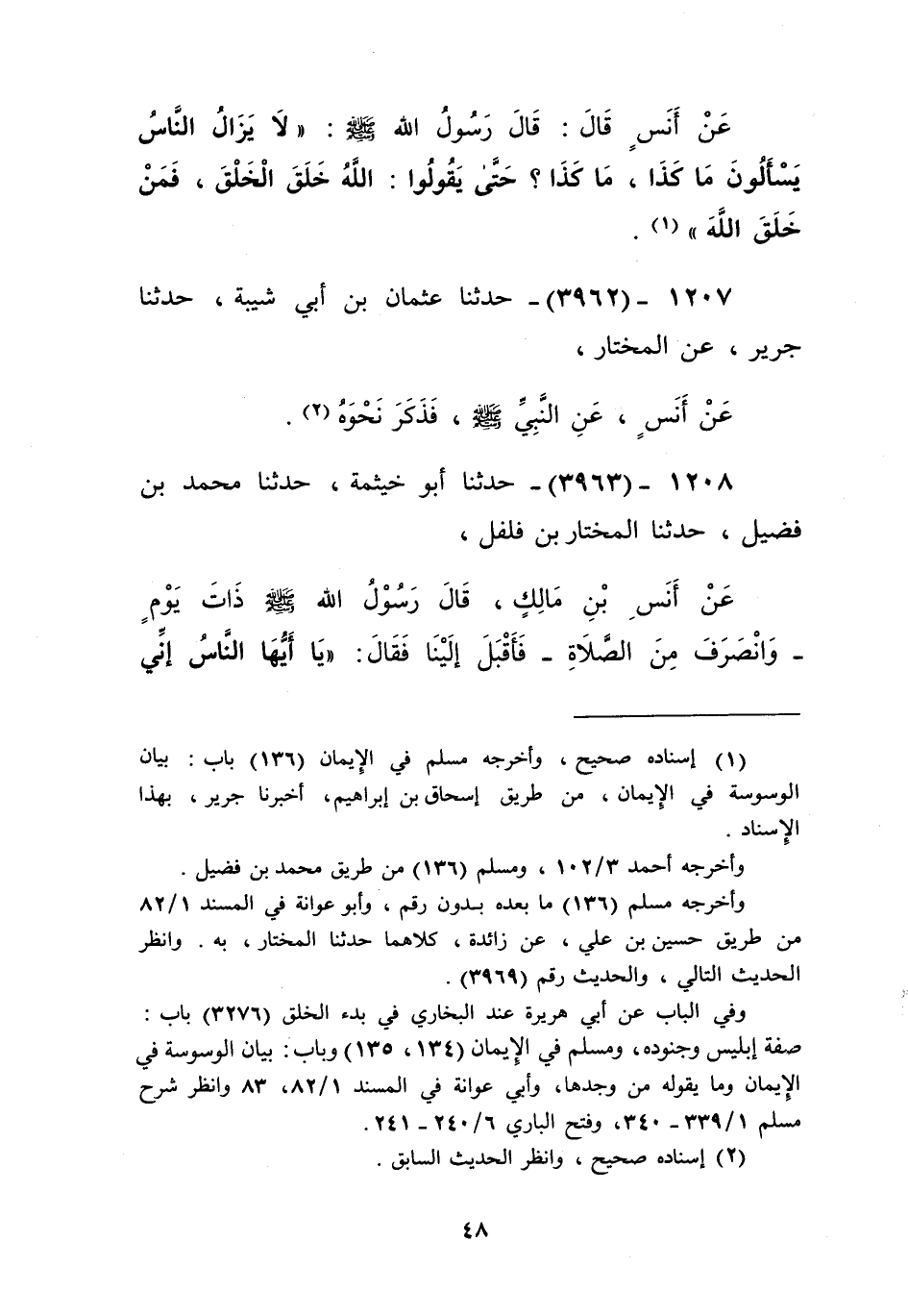 3963 - حَدَّثَنَا أَبُو خَيْثَمَةَ، حَدَّثَنَا مُحَمَّدُ بْنُ فُضَيْلٍ، حَدَّثَنَا الْمُخْتَارُ بْنُ فُلْفُلٍ، عَنْ أَنَسِ بْنِ مَالِكٍ، قَالَ رَسُولُ اللَّهِ صَلَّى اللهُ عَلَيْهِ وَسَلَّمَ ذَاتَ يَوْمٍ، وَانْصَرَفَ مِنَ الصَّلَاةِ، فَأَقْبَلَ إِلَيْنَا فَقَالَ: «يَا أَيُّهَا النَّاسُ §إِنِّي إِمَامُكُمْ، فَلَا تَسْبِقُونِي بِالرُّكُوعِ، وَلَا بِالسُّجُودِ، وَلَا بِالْقِيَامِ، وَلَا بِالْقُعُودِ، وَلَا بِالِانْصِرَافِ، فَإِنِّي أَرَاكُمْ مِنْ أَمَامِي وَمِنْ خَلْفِي، وَالَّذِي نَفْسِي بِيَدِهِ لَوْ رَأَيْتُمْ مَا رَأَيْتُ لَضَحِكْتُمْ قَلِيلًا وَلَبَكَيْتُمْ كَثِيرًا»، قَالُوا: يَا رَسُولَ اللَّهِ، مَا رَأَيْتَ؟، قَالَ: «رَأَيْتُ الْجَنَّةَ وَالنَّارَ» Kإسناده صحيح